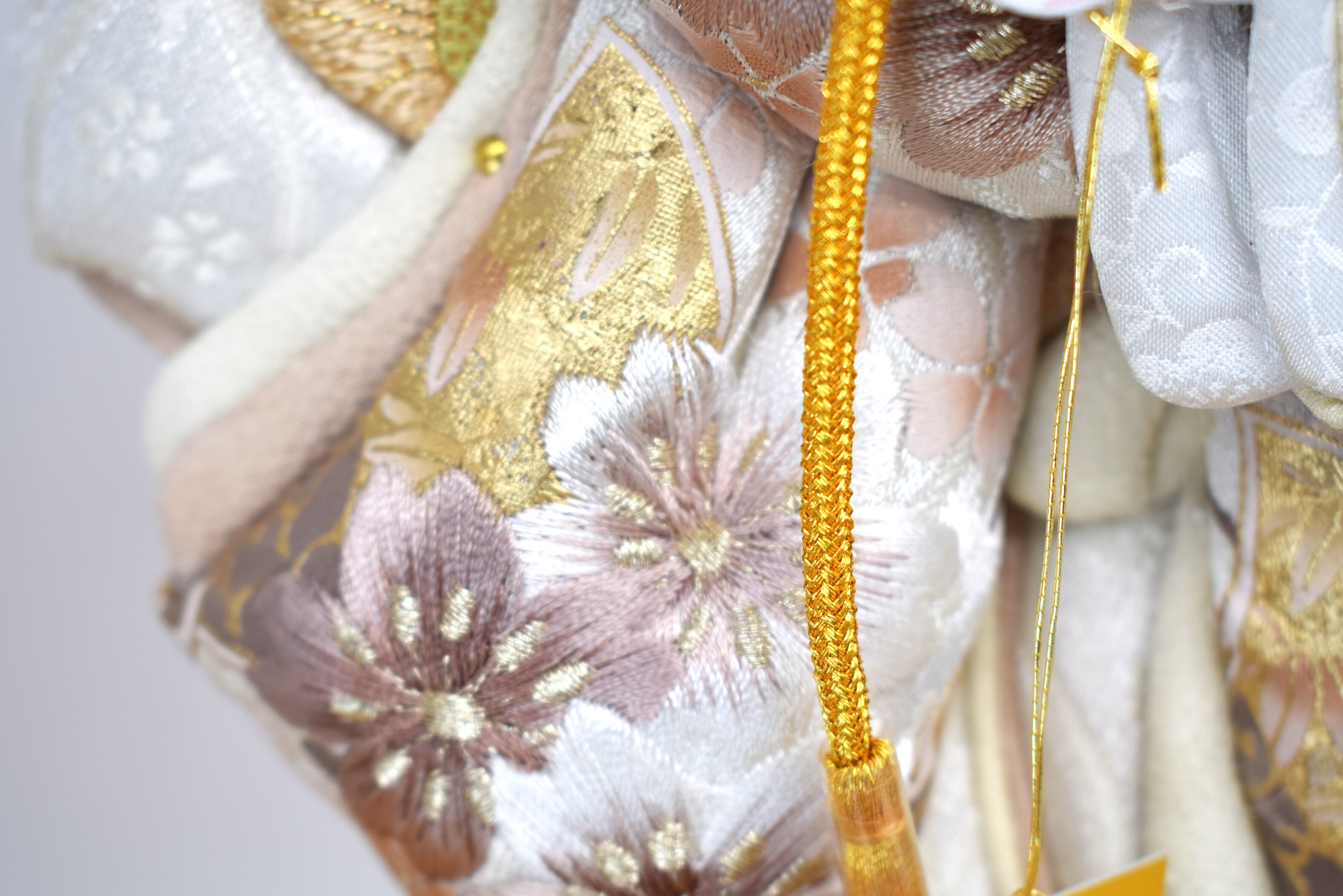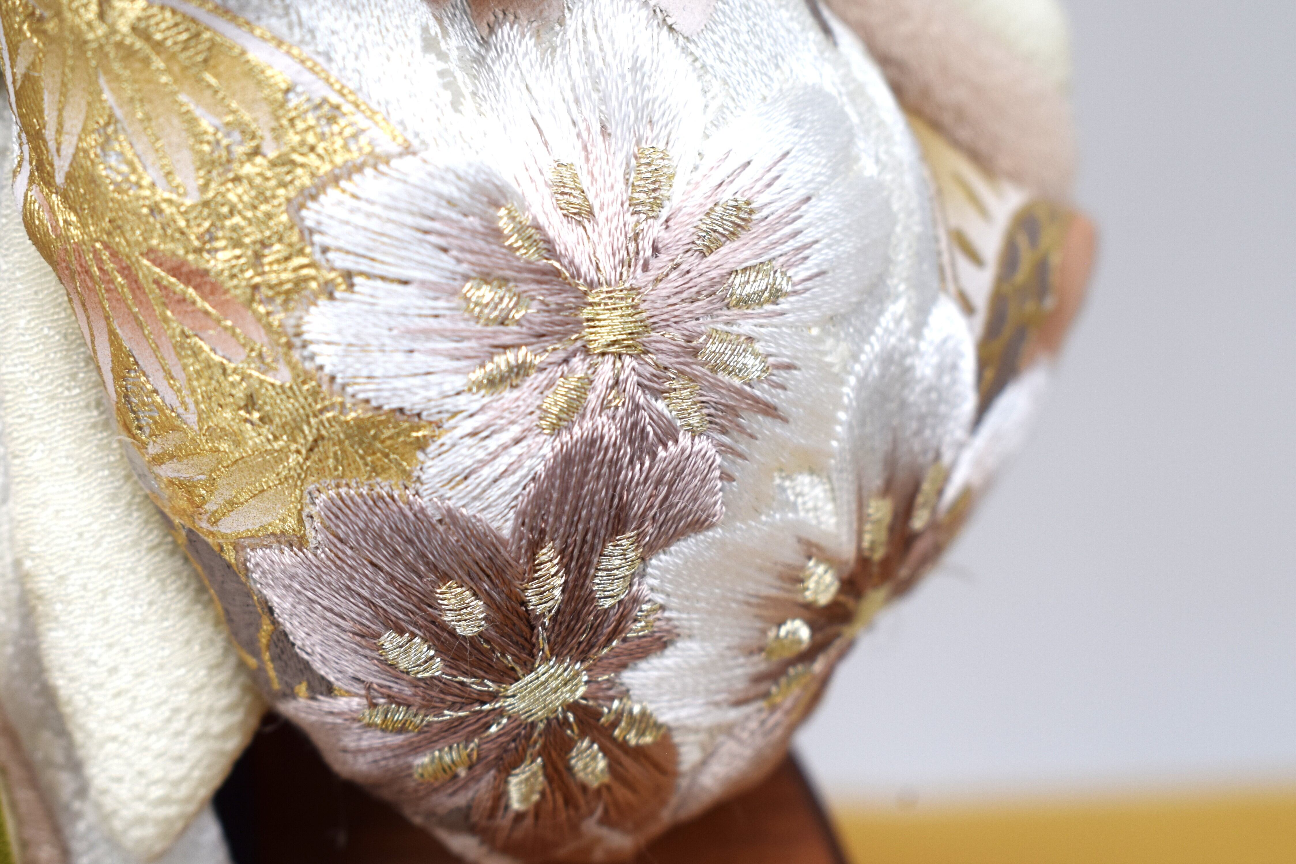 淡い桜柄の衣裳は優雅で、上品な輝きを放ちます。