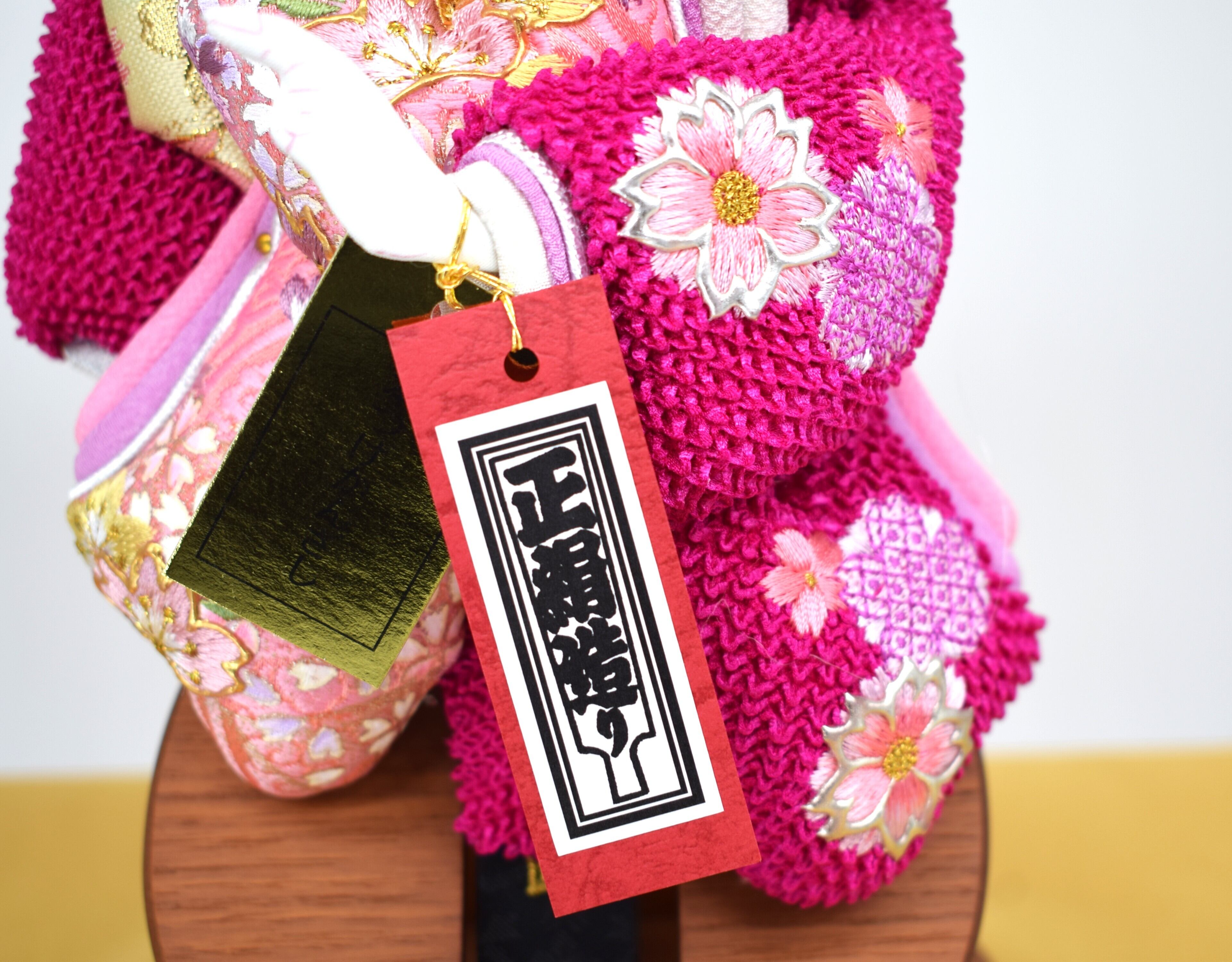 艶やかな紅紫の鹿の子絞り生地に、可憐な桜刺繍をあしらった華やかな押絵羽子板です。