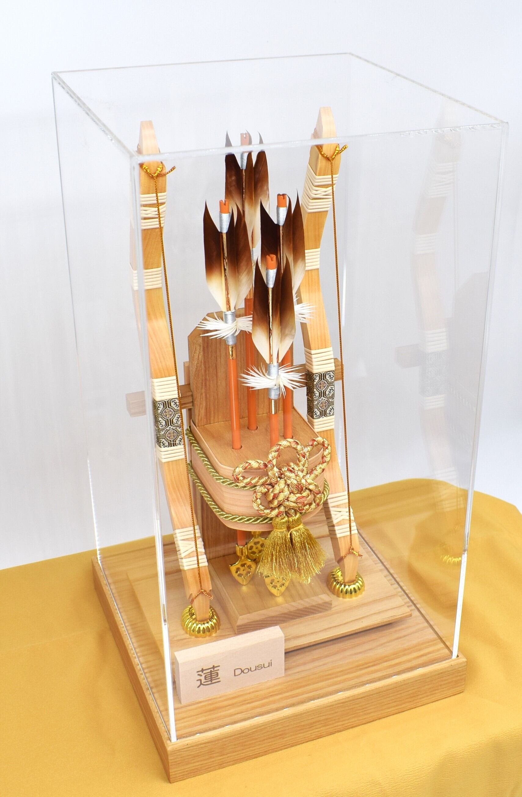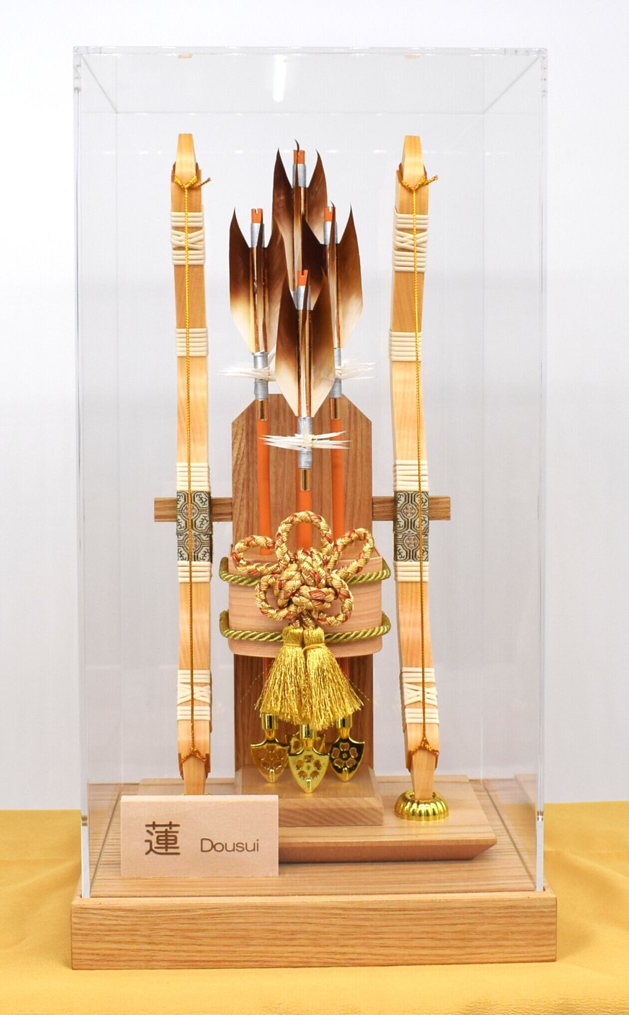 自然木の風合いを生かした木製台座に、重厚な矢羽根を配した上品な破魔弓飾り「蓮(Dousui)」です。