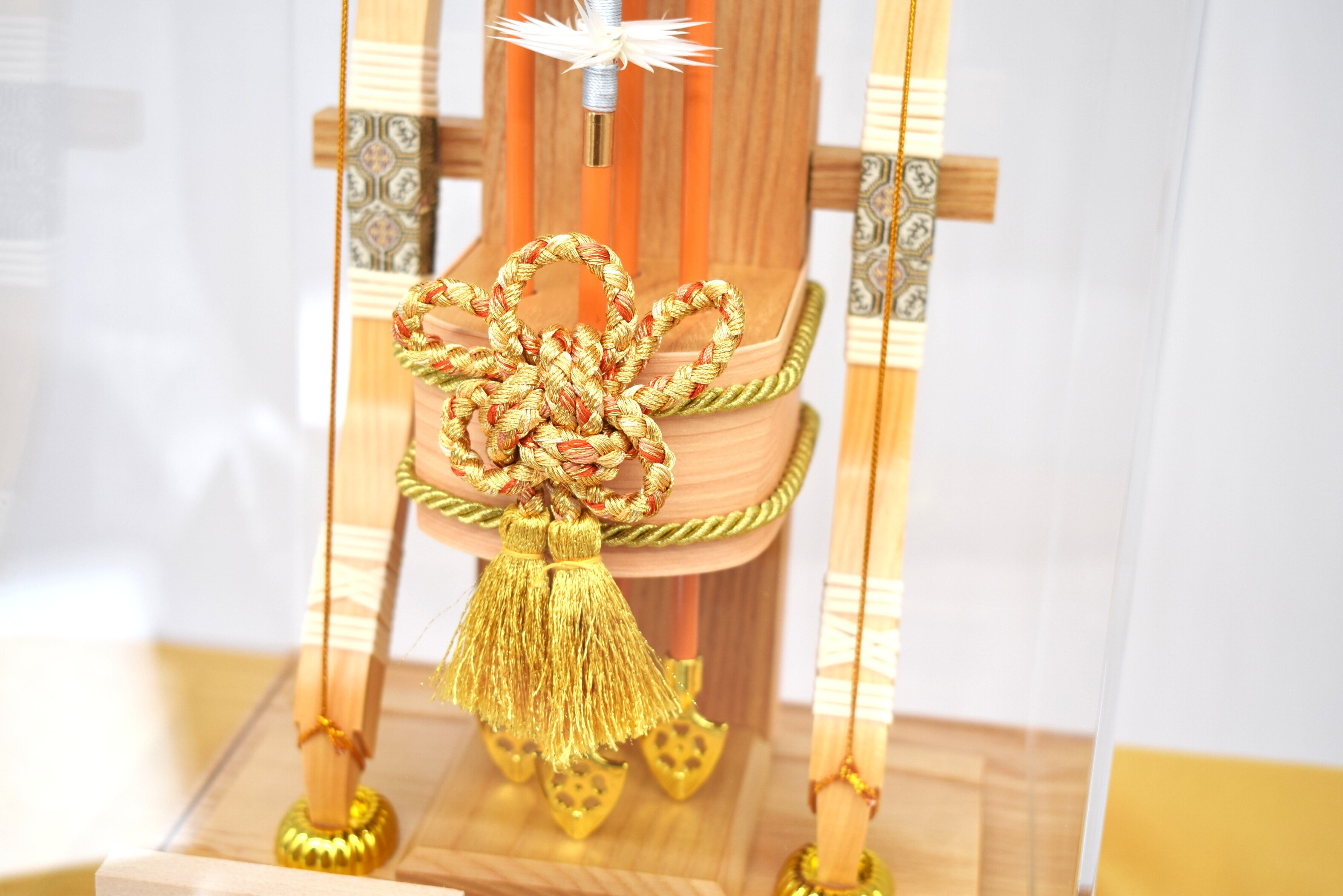 金糸の結び飾りは繁栄と絆を、弓と矢は勇気と守護を象徴。