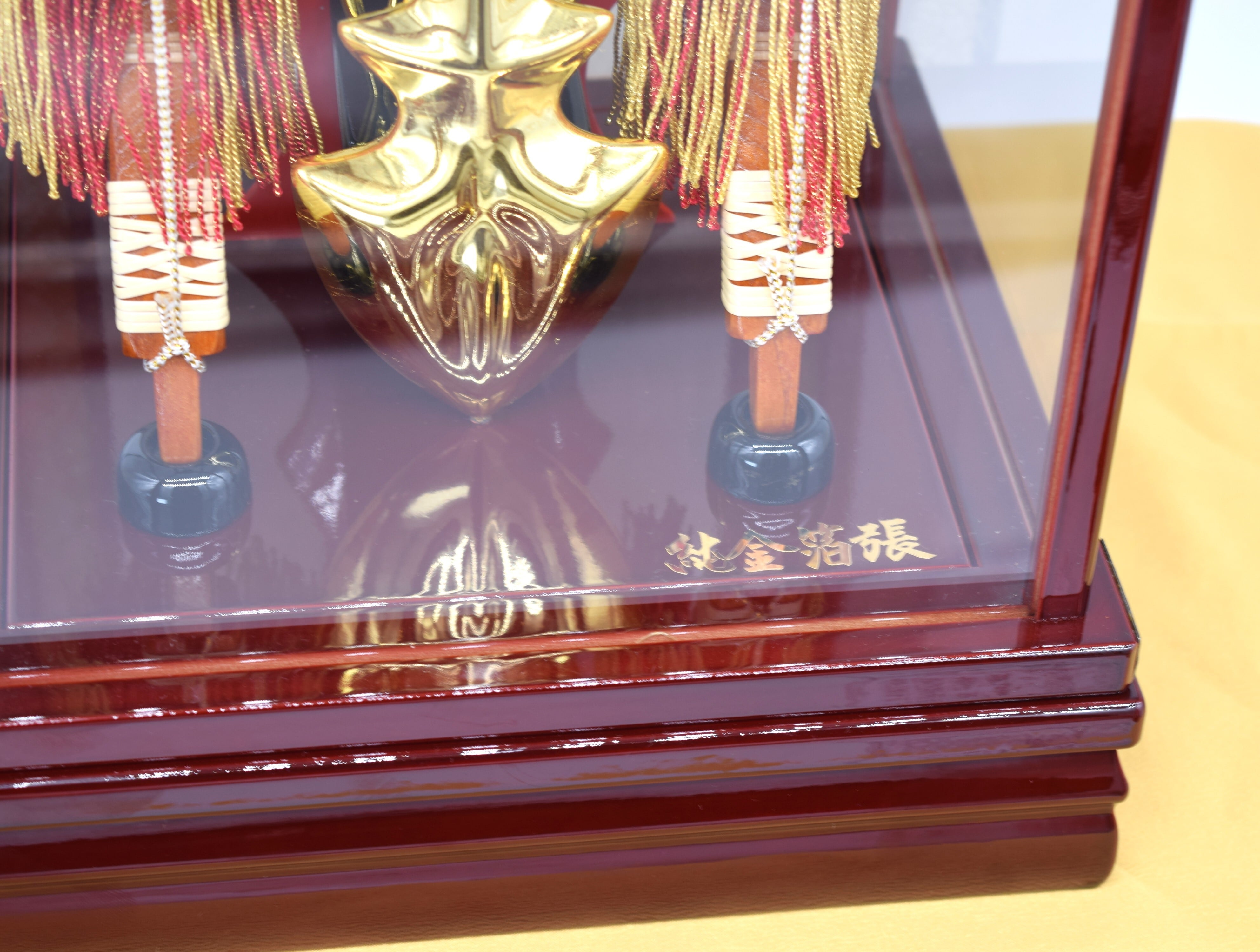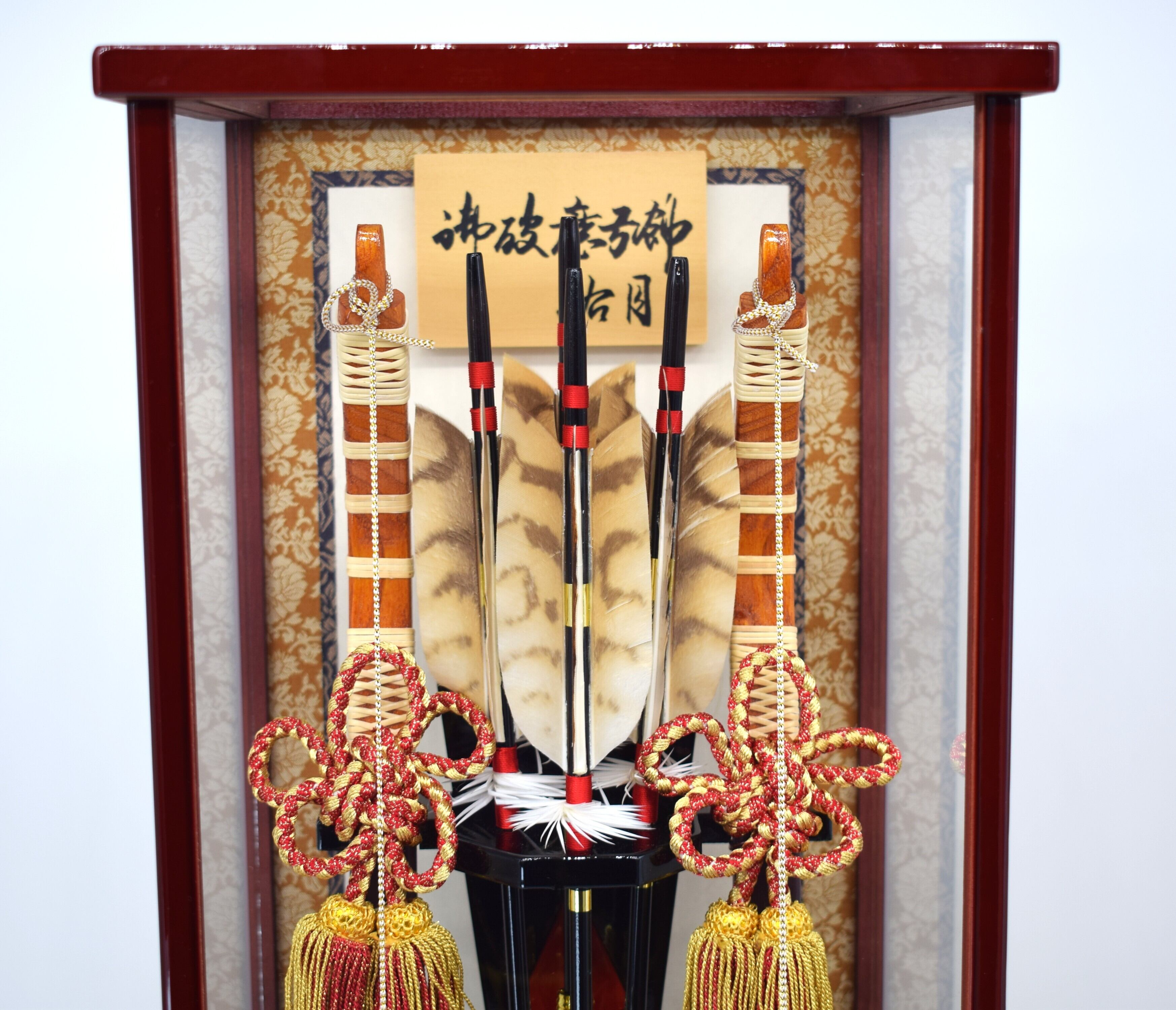 艶やかな漆調の木製ケースに収めた、格式ある破魔弓飾りです。