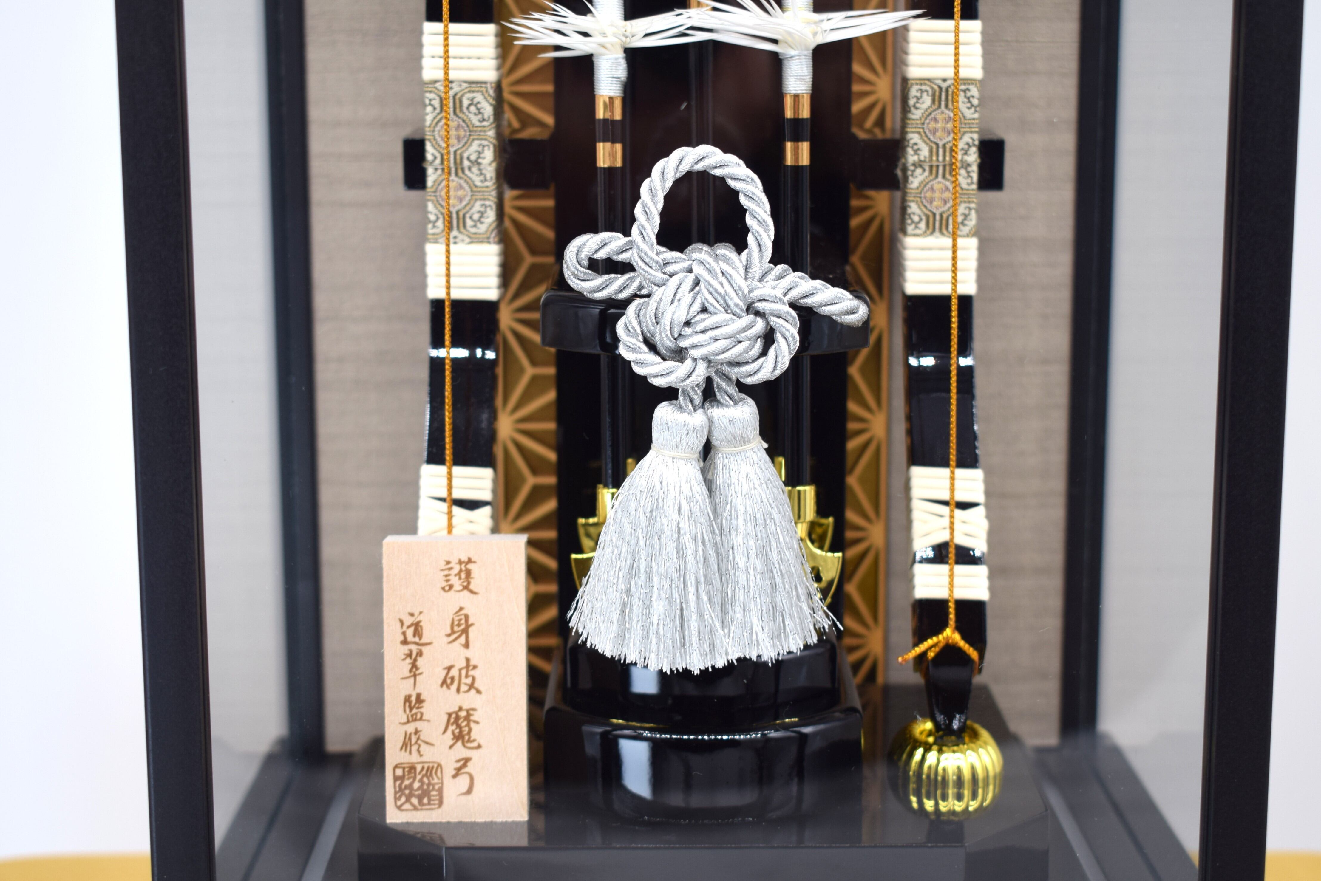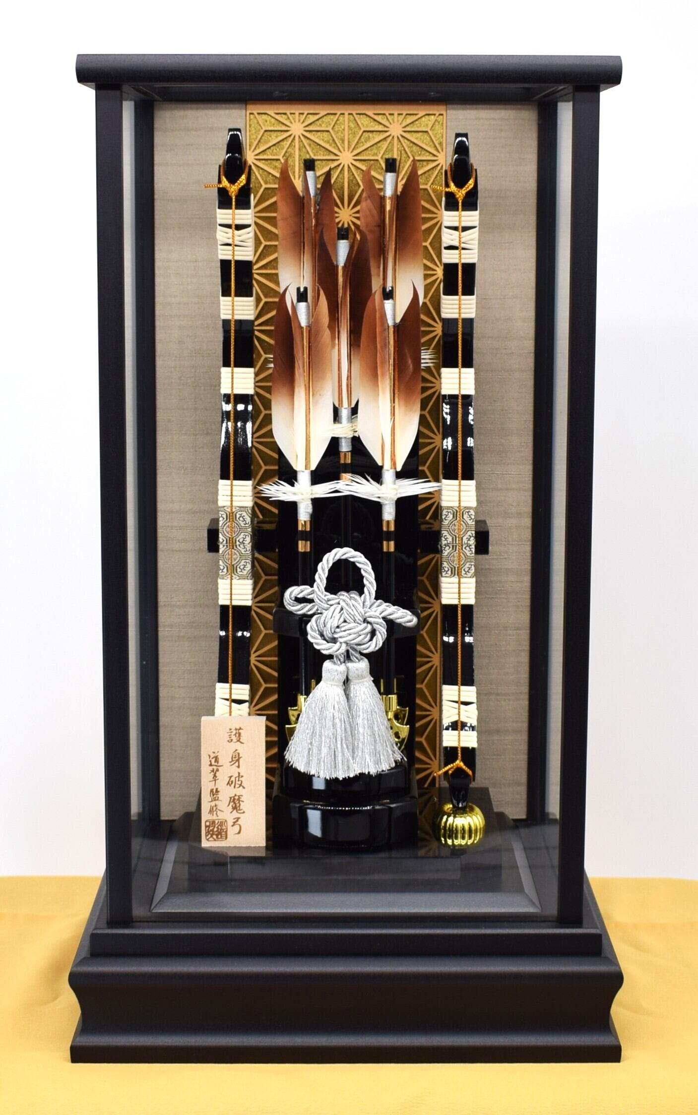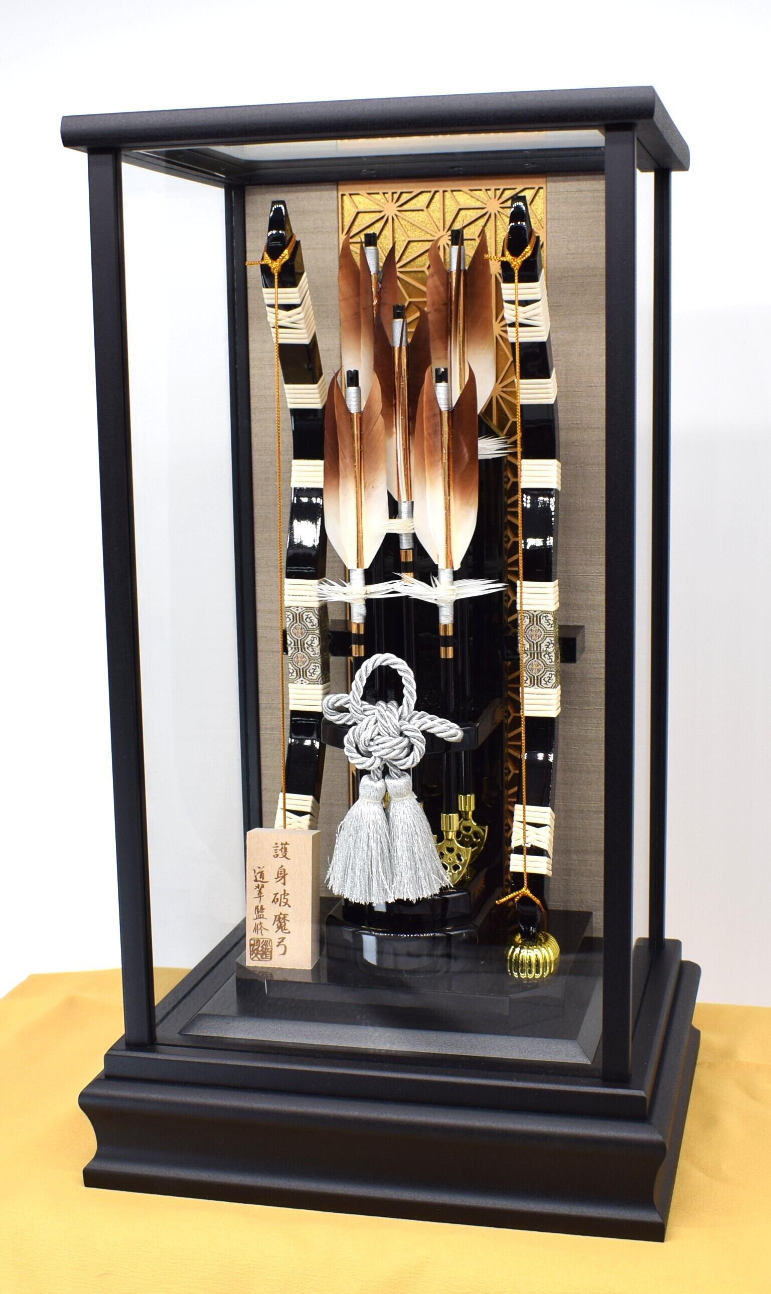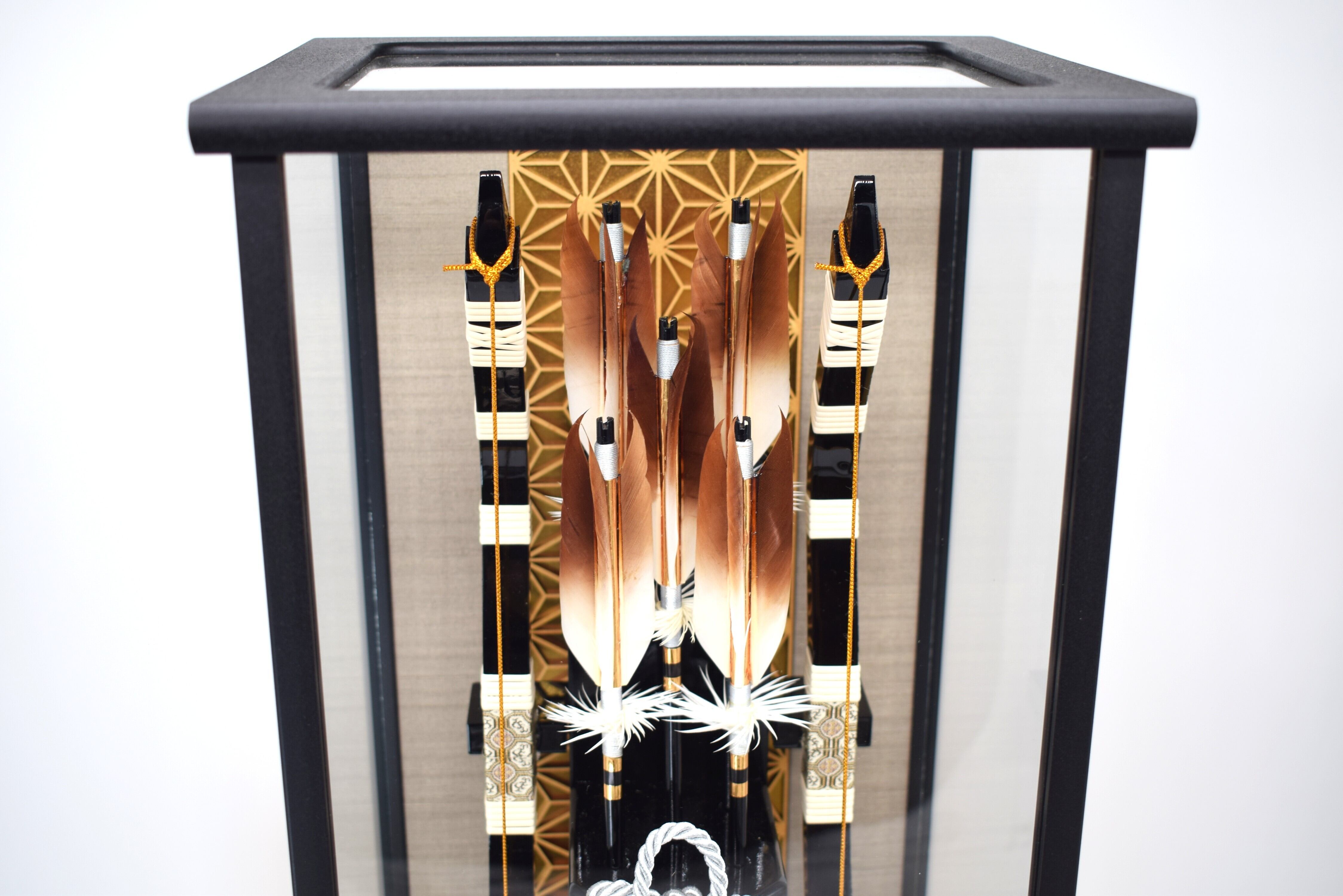 黒と金のコントラストが美しく映える、現代的で洗練された破魔弓飾りです。
