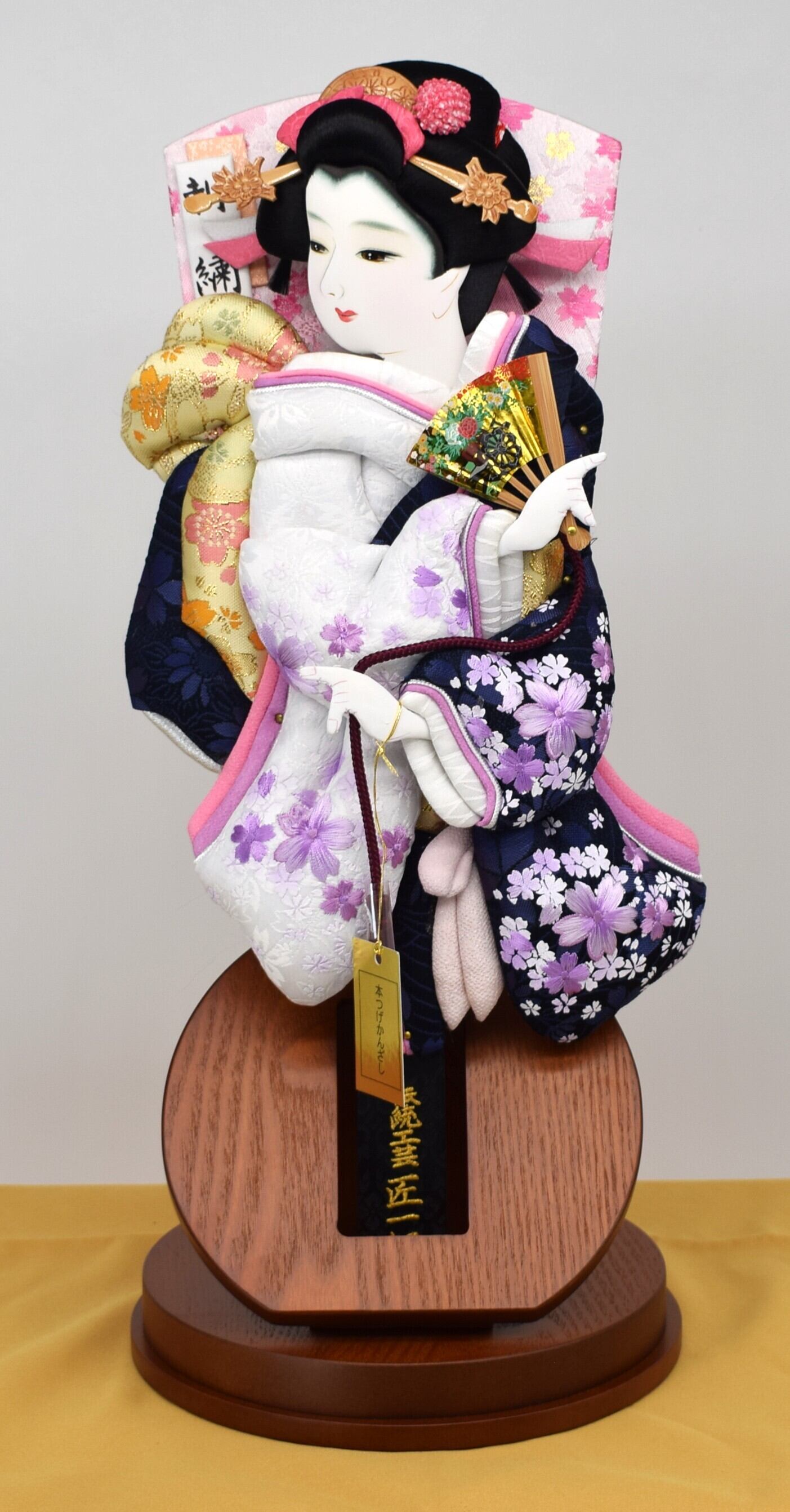 上品な紺地に桜柄をあしらった、落ち着きと華やかさを兼ね備えた押絵羽子板です。