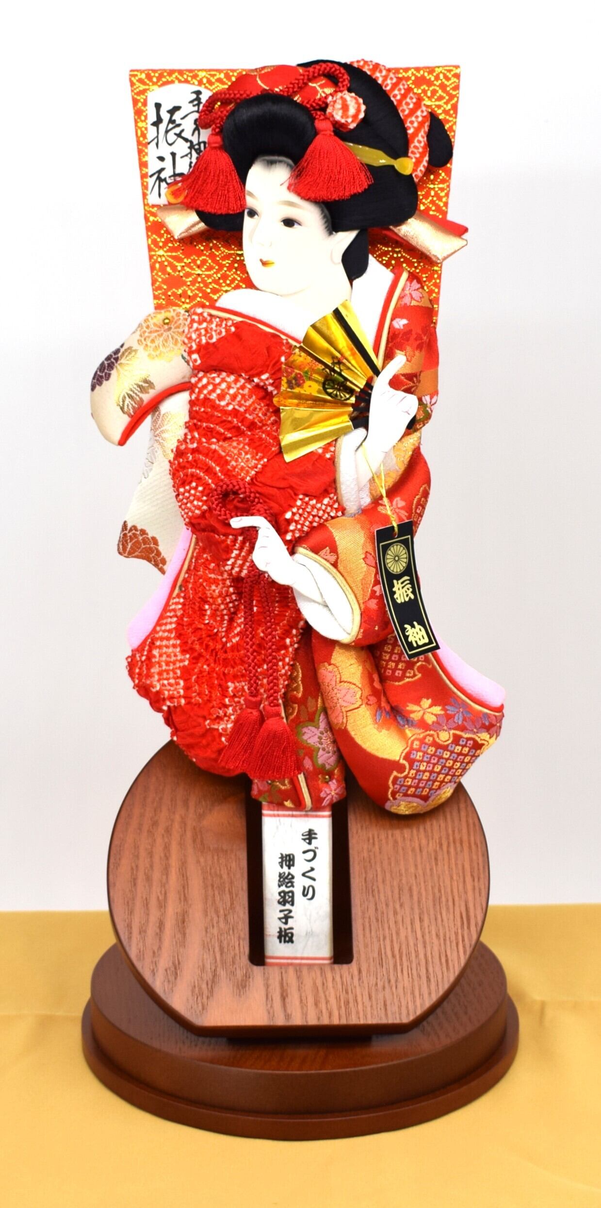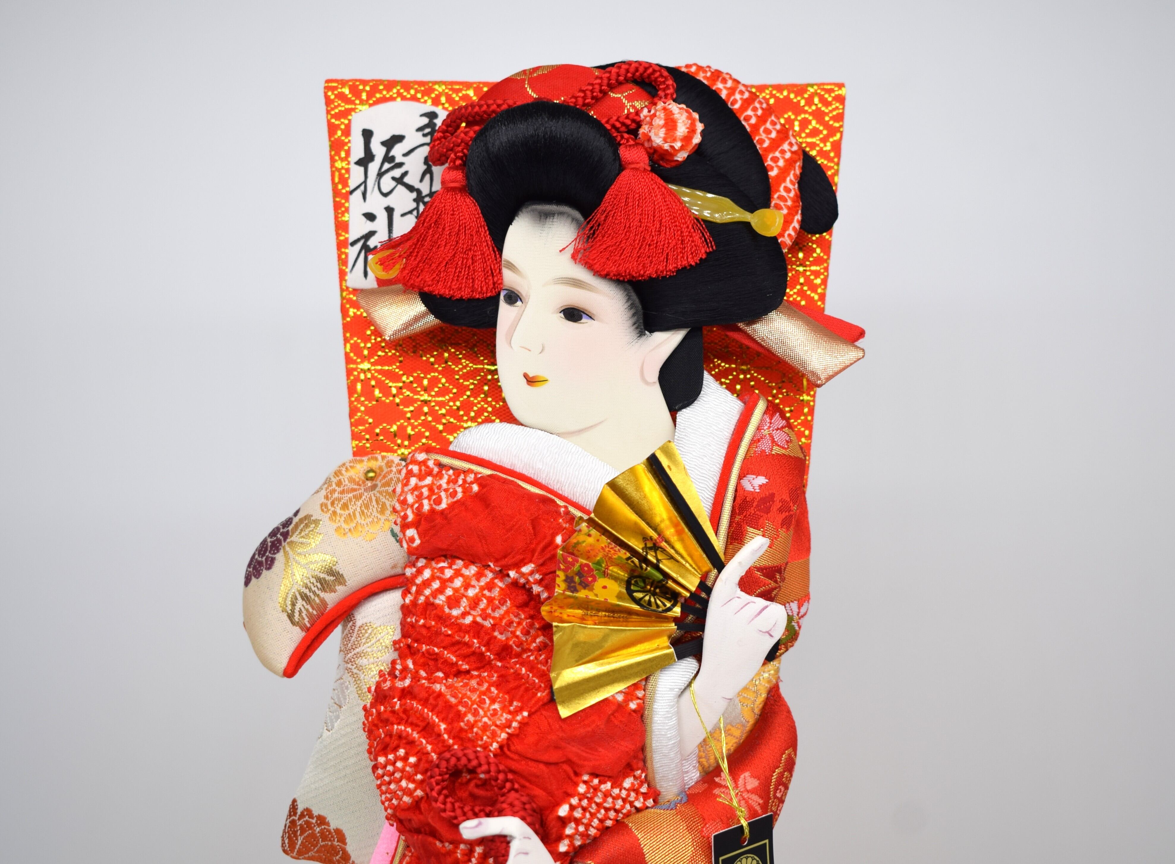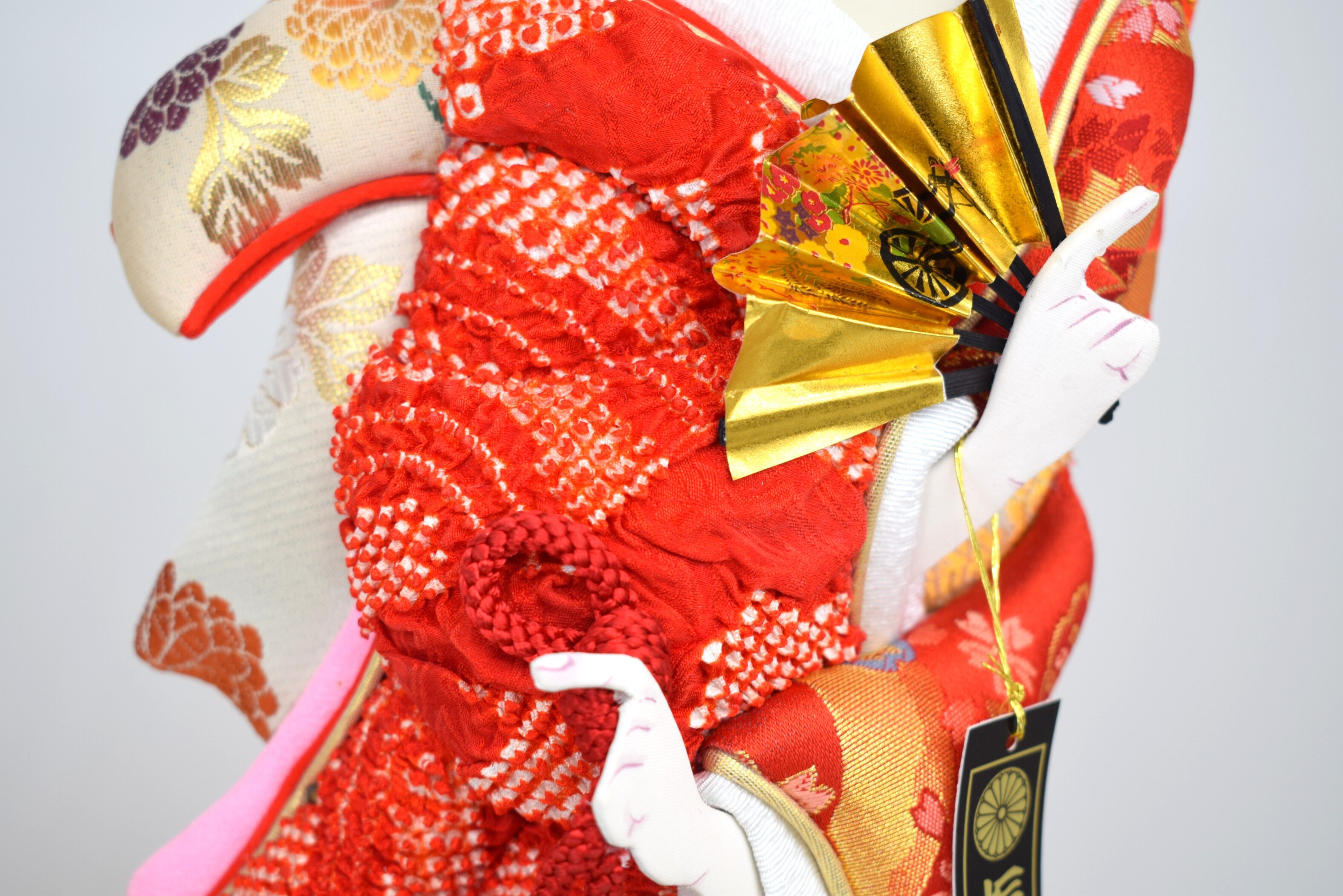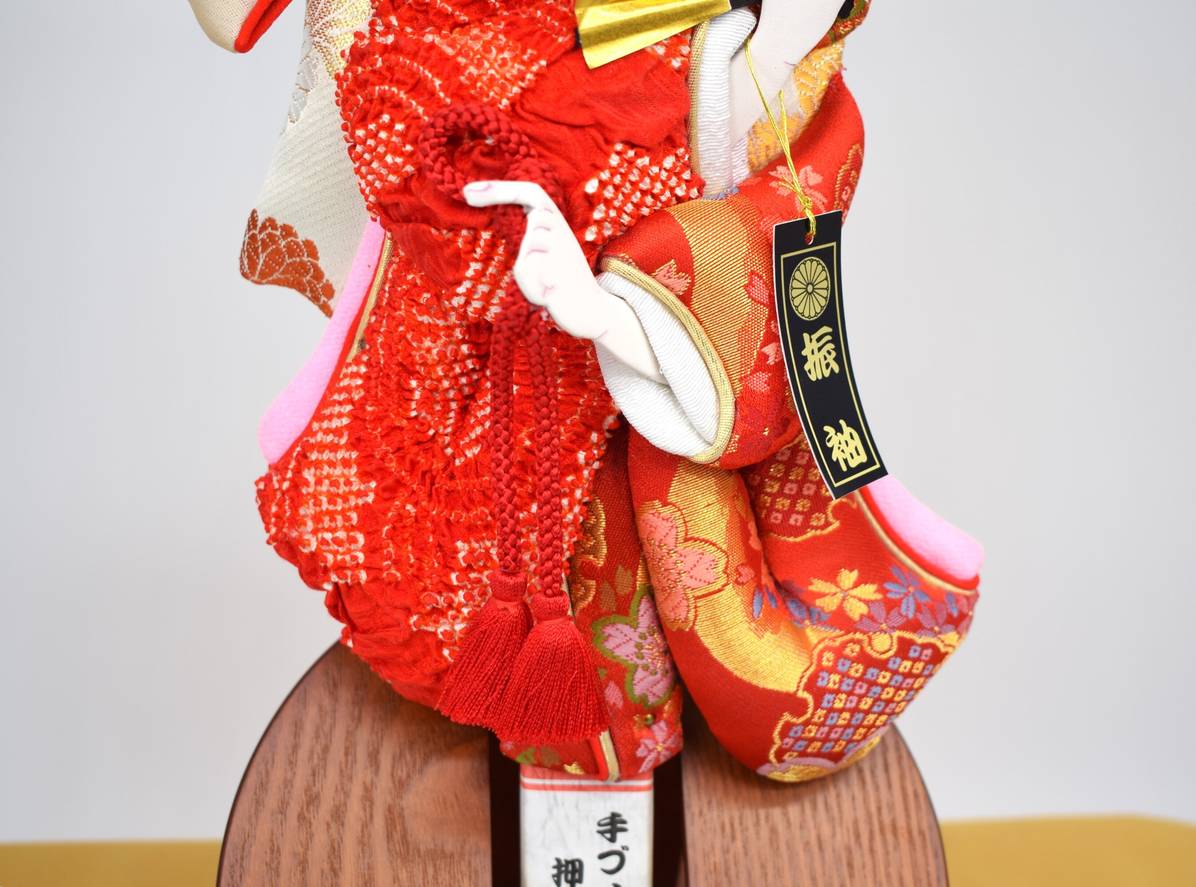 華やかな赤い振袖に、伝統の鹿の子絞り生地を使用した豪華な押絵羽子板です。