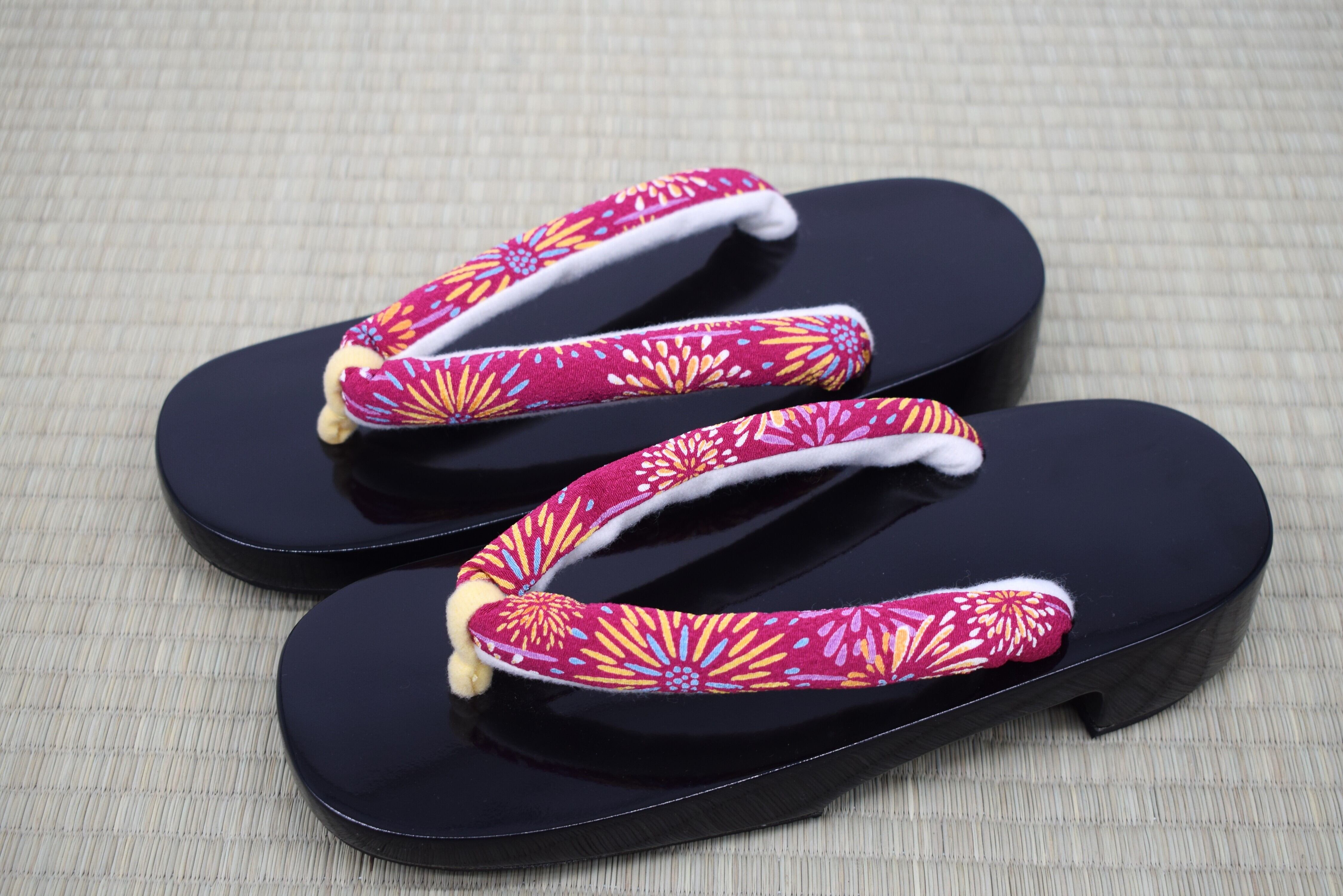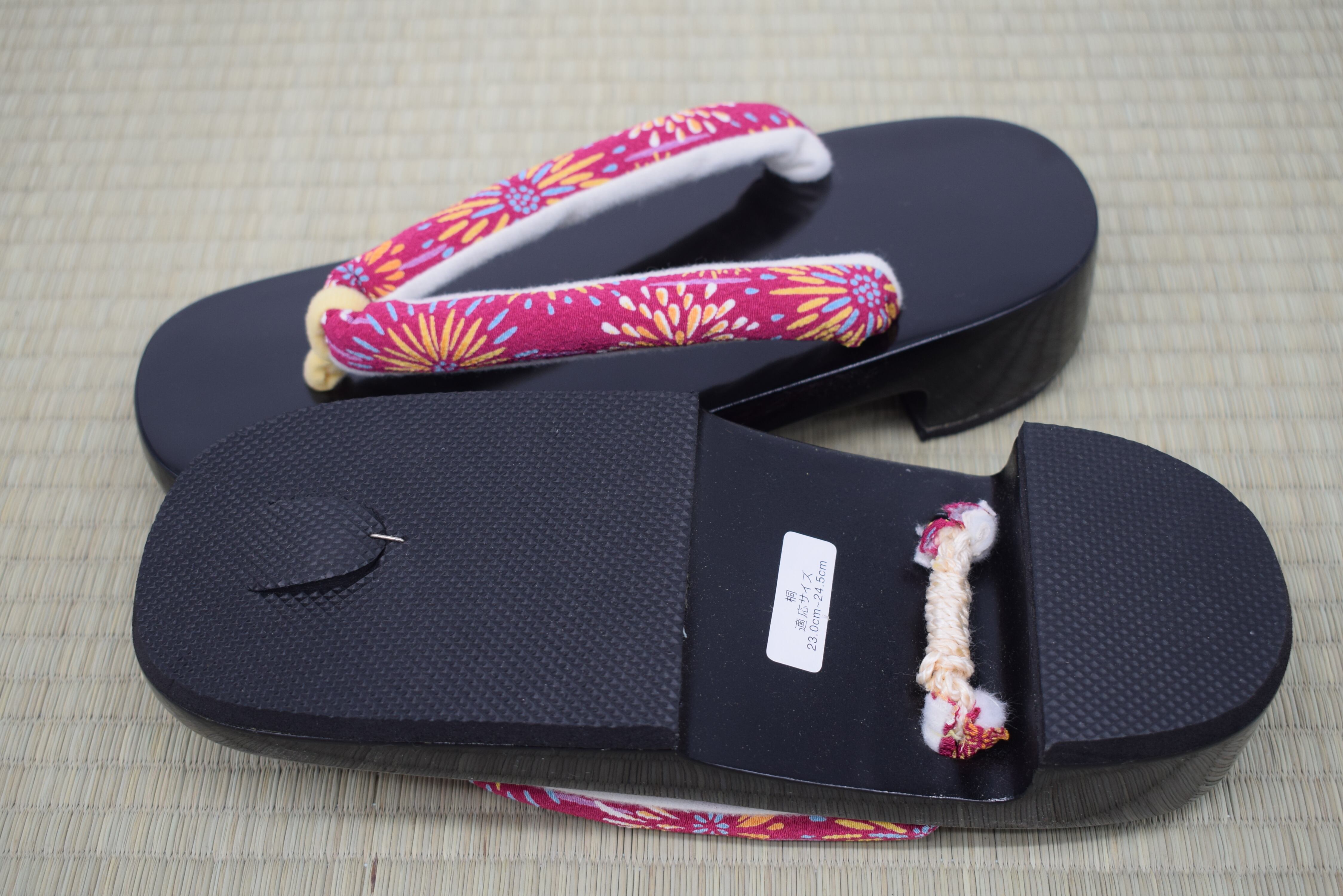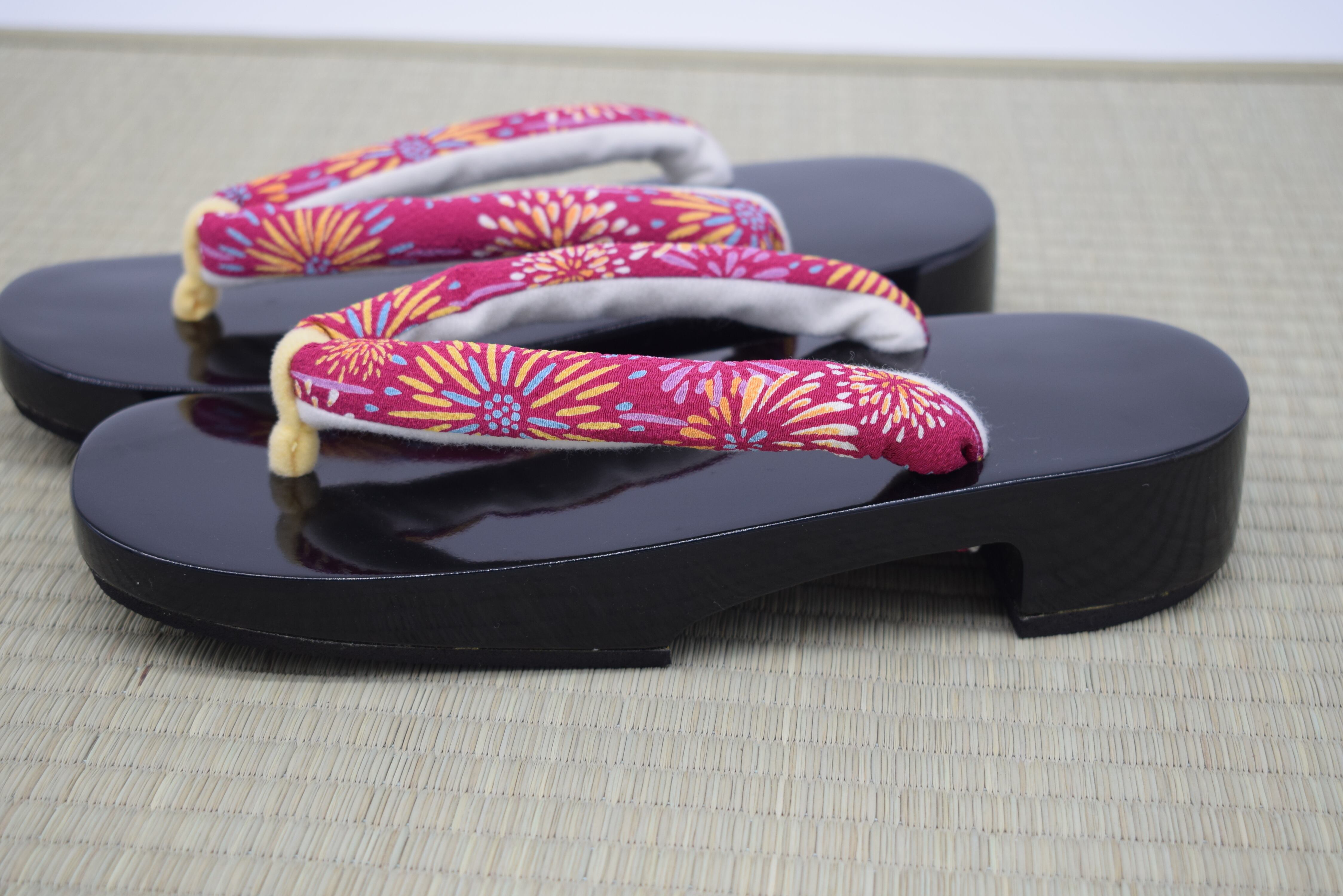 カラー:黒塗り(艶あり)+ 和柄鼻緒(赤系・花模様)