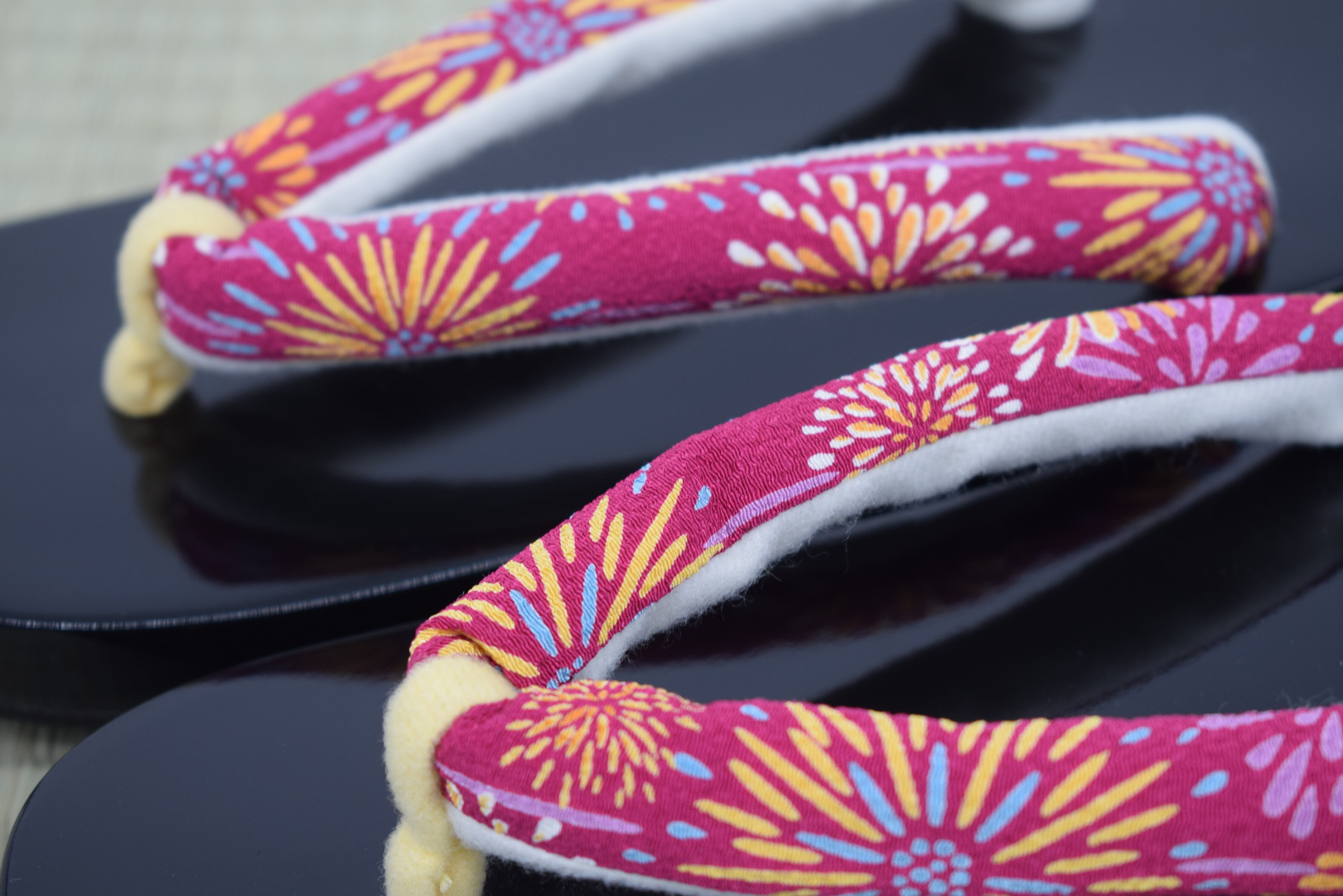 ✔ 華やかな鼻緒 – 和柄の布を使用し、足元を彩る