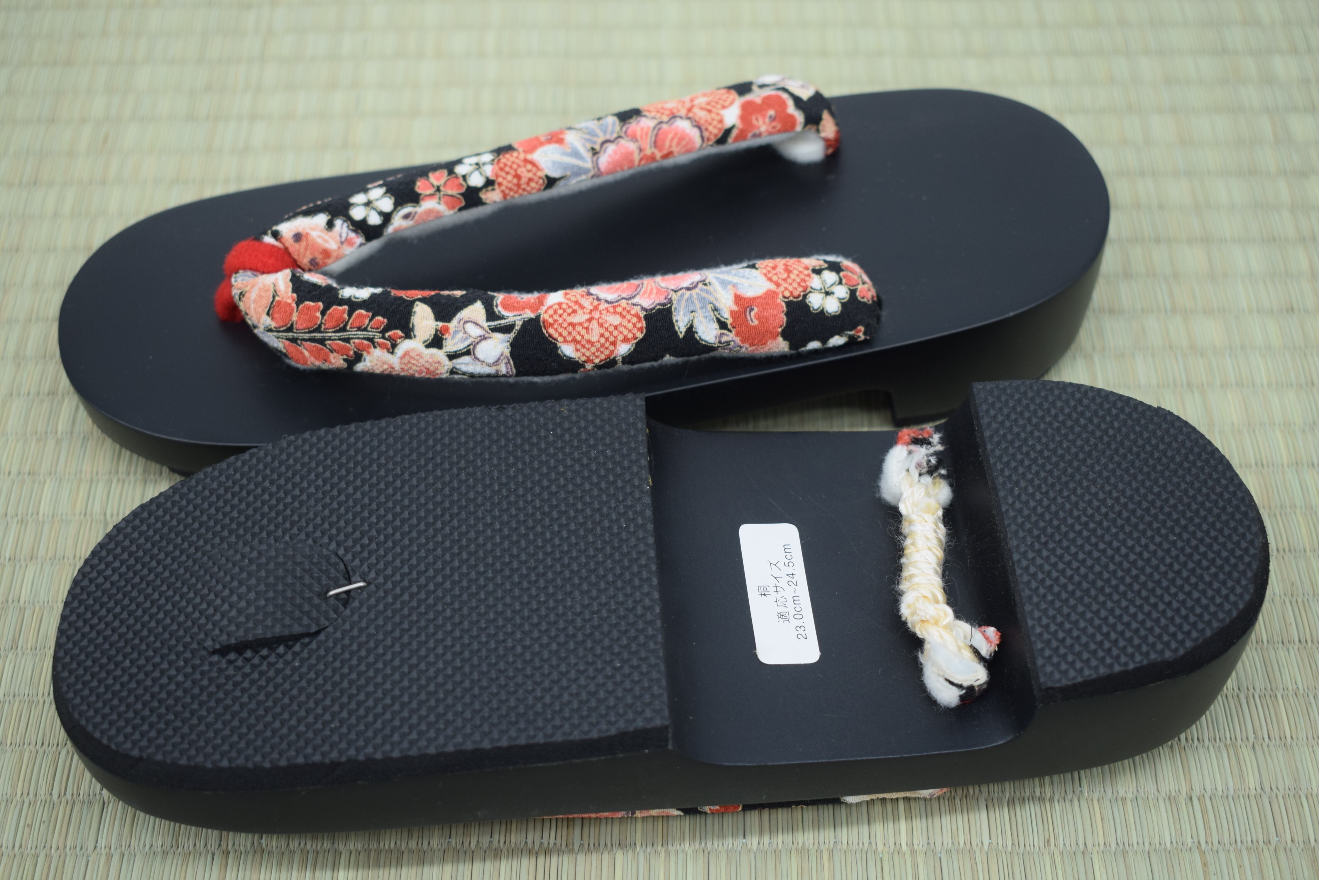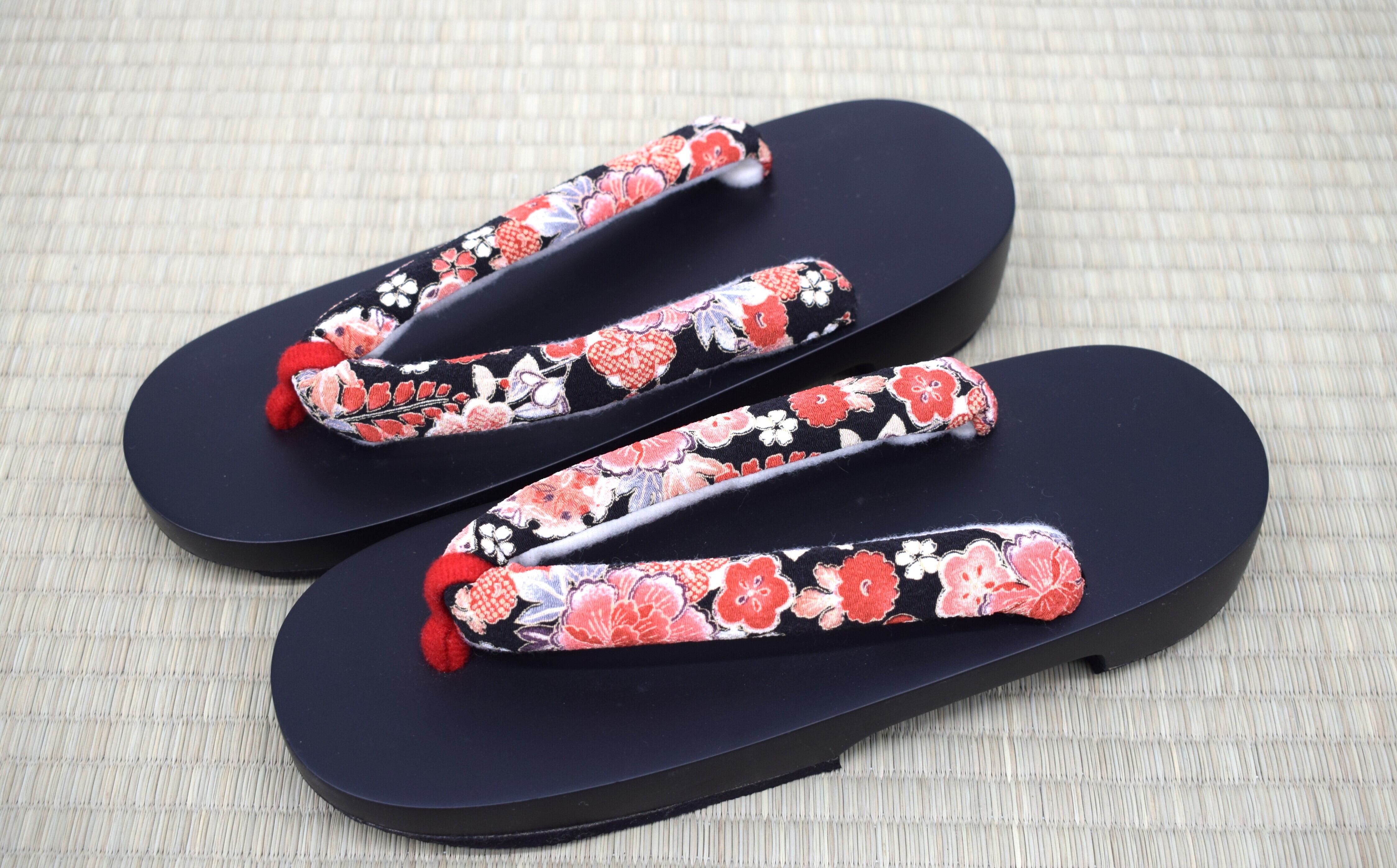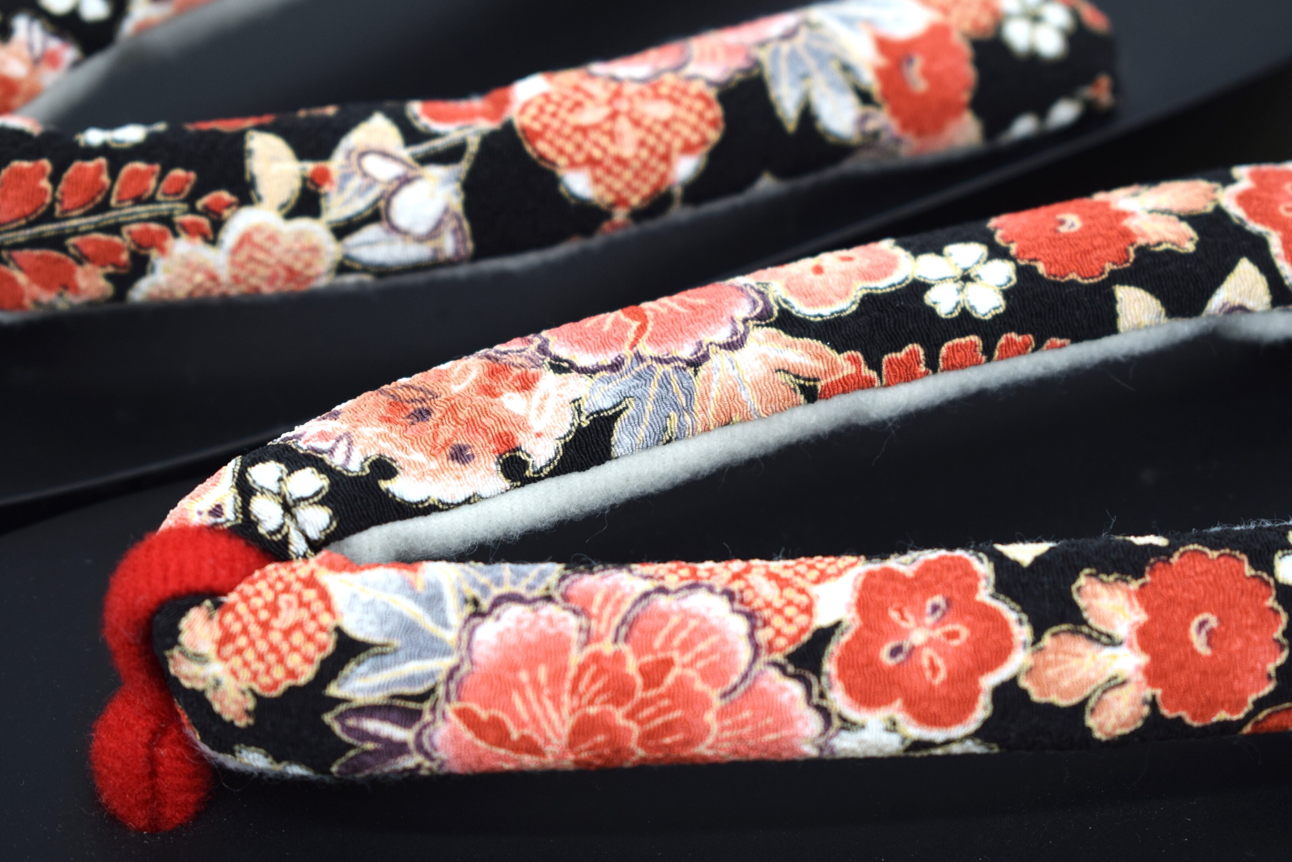 カラー:黒塗り(艶あり)+ 和花柄鼻緒(赤・黒系)