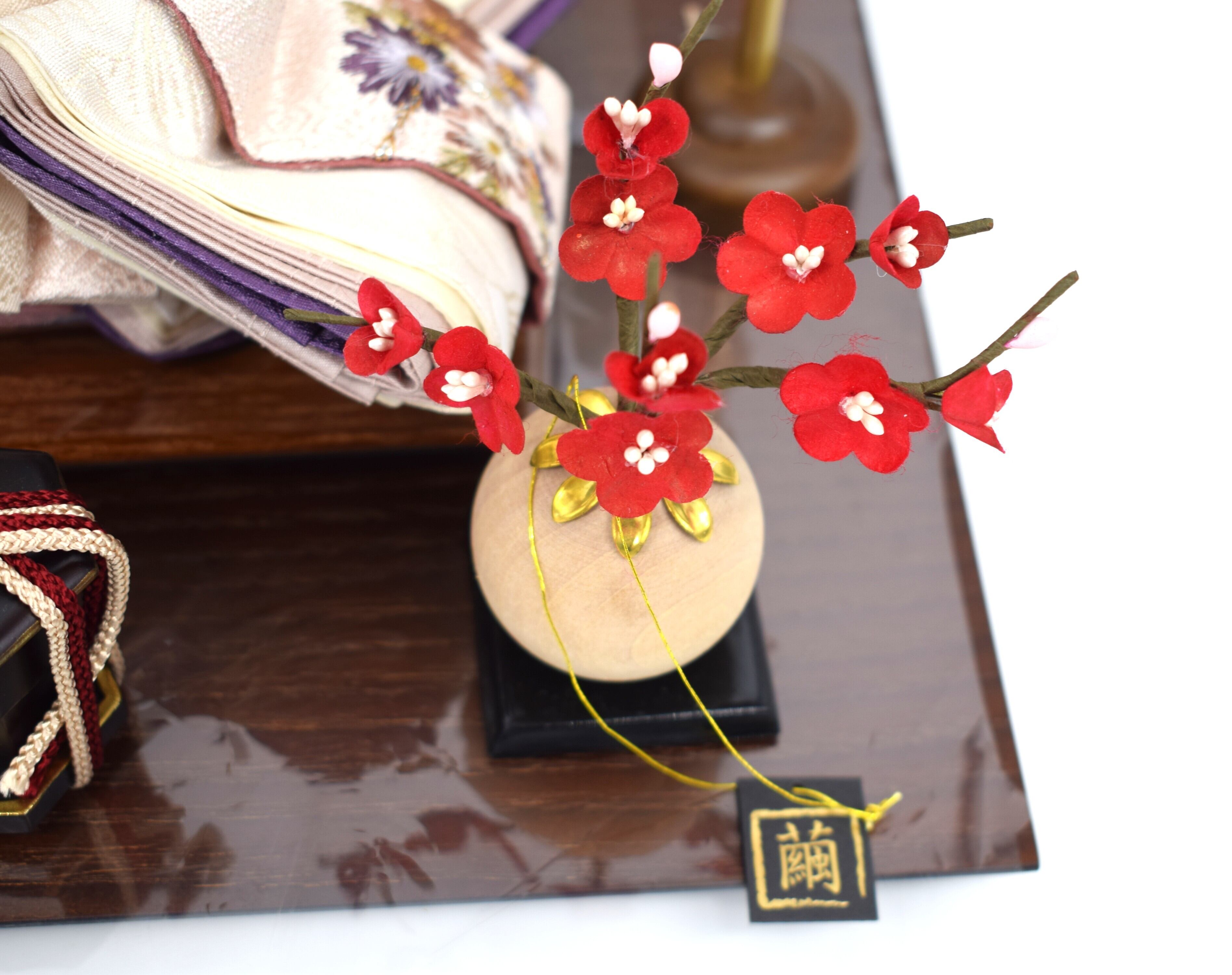 木目調の飾り台とモダンな雪洞(ぼんぼり)、紅白梅の花飾りが調和し、現代のお部屋にもぴったり馴染むナチュラルモダンなデザインです。
