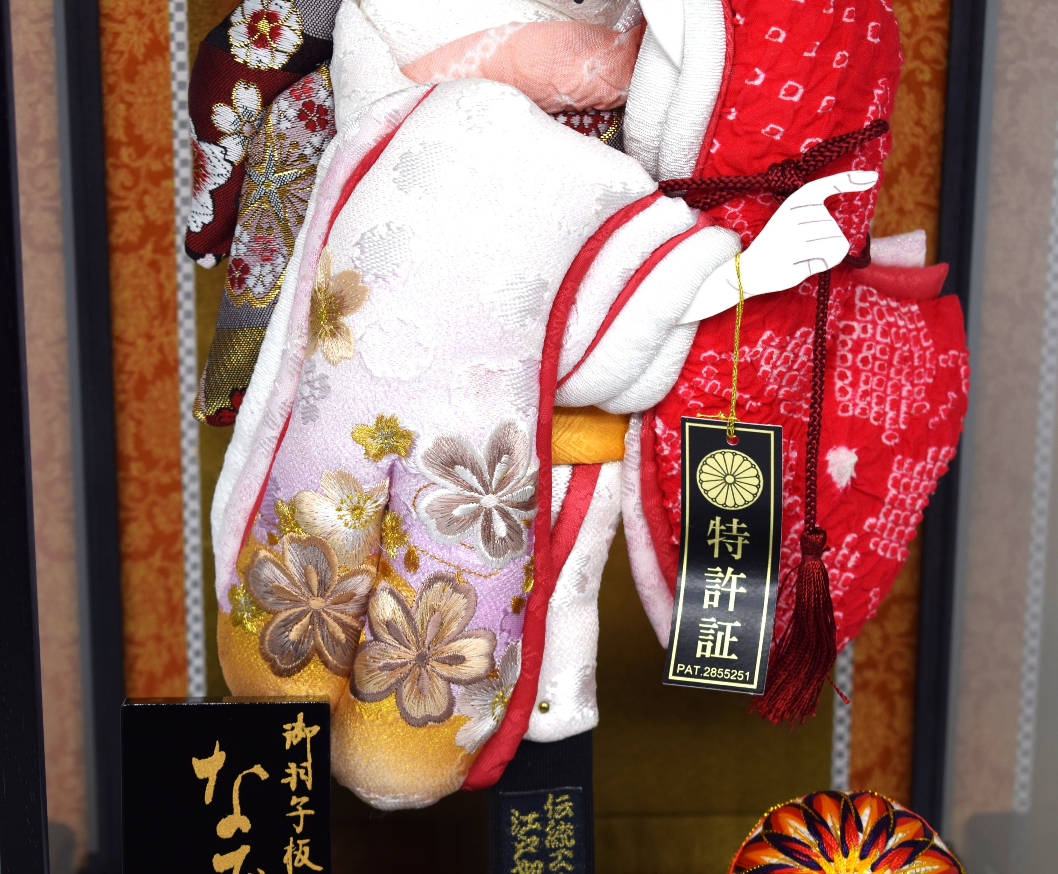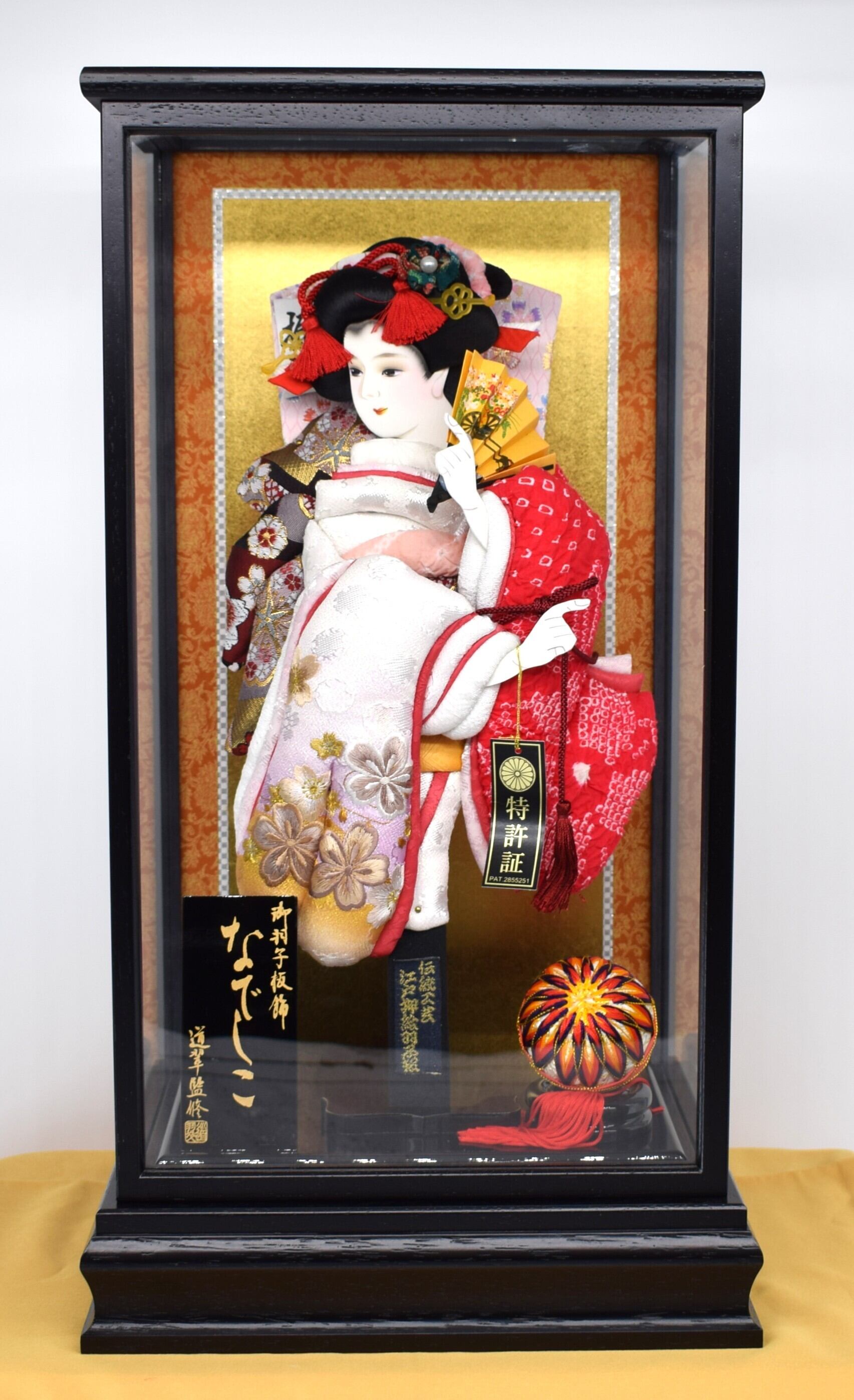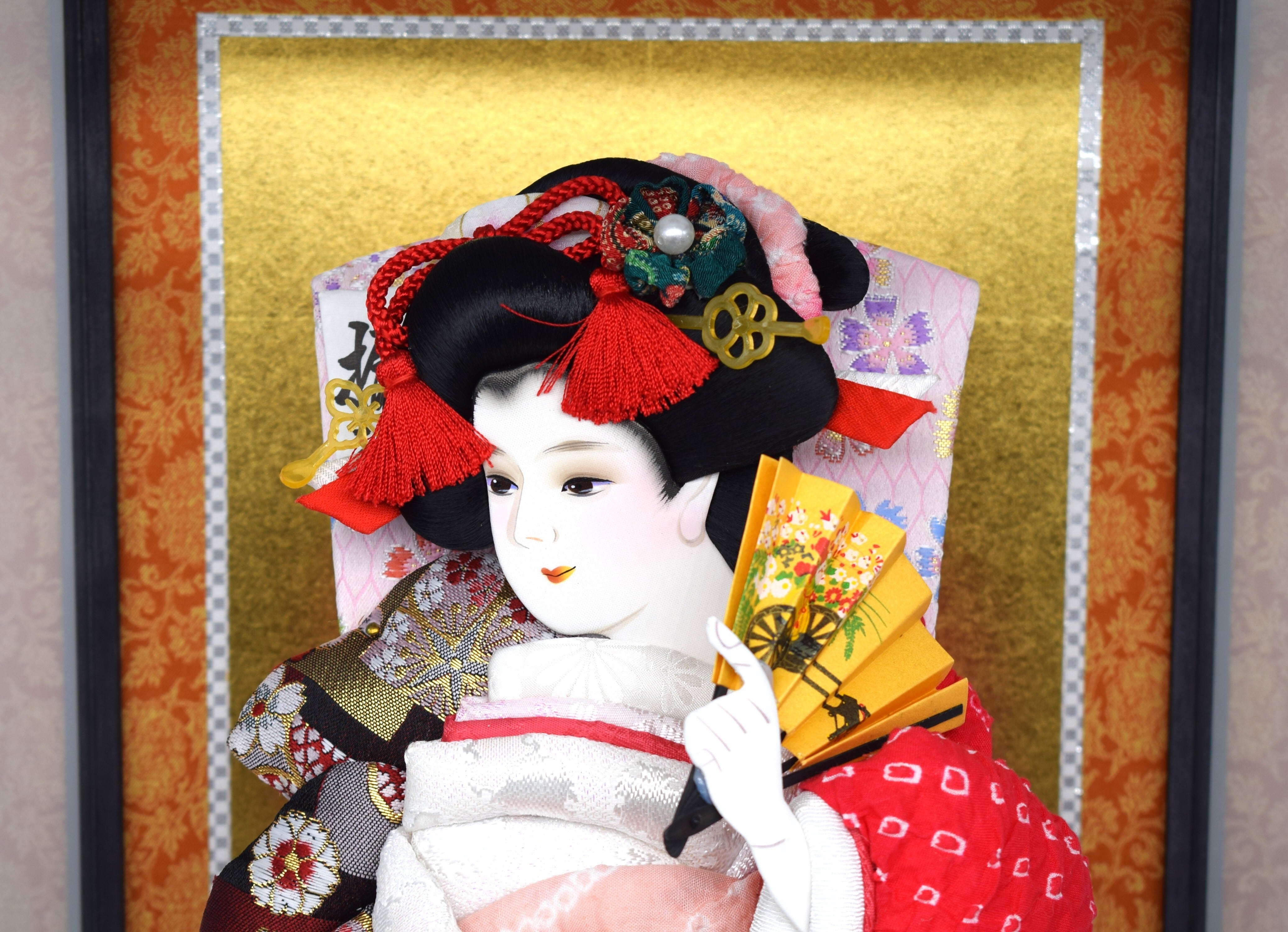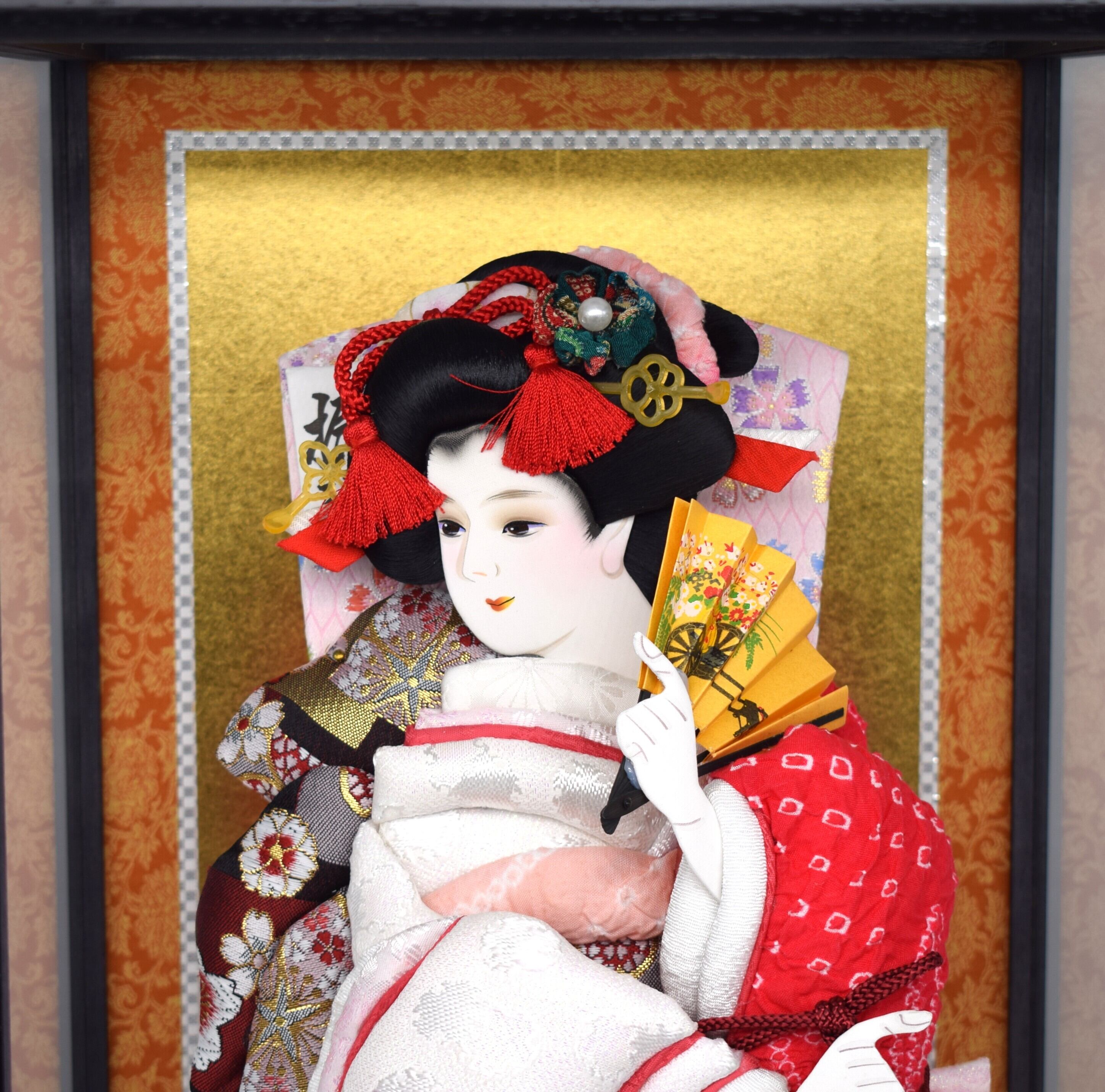 お顔は手描きのやさしい表情で、伝統的な京風美人を表現。衣裳には金彩や友禅柄を合わせ、可憐さと雅さを兼ね備えた高級仕様です。背景には金襴を使用し、ケース内を明るく華やかに演出します。