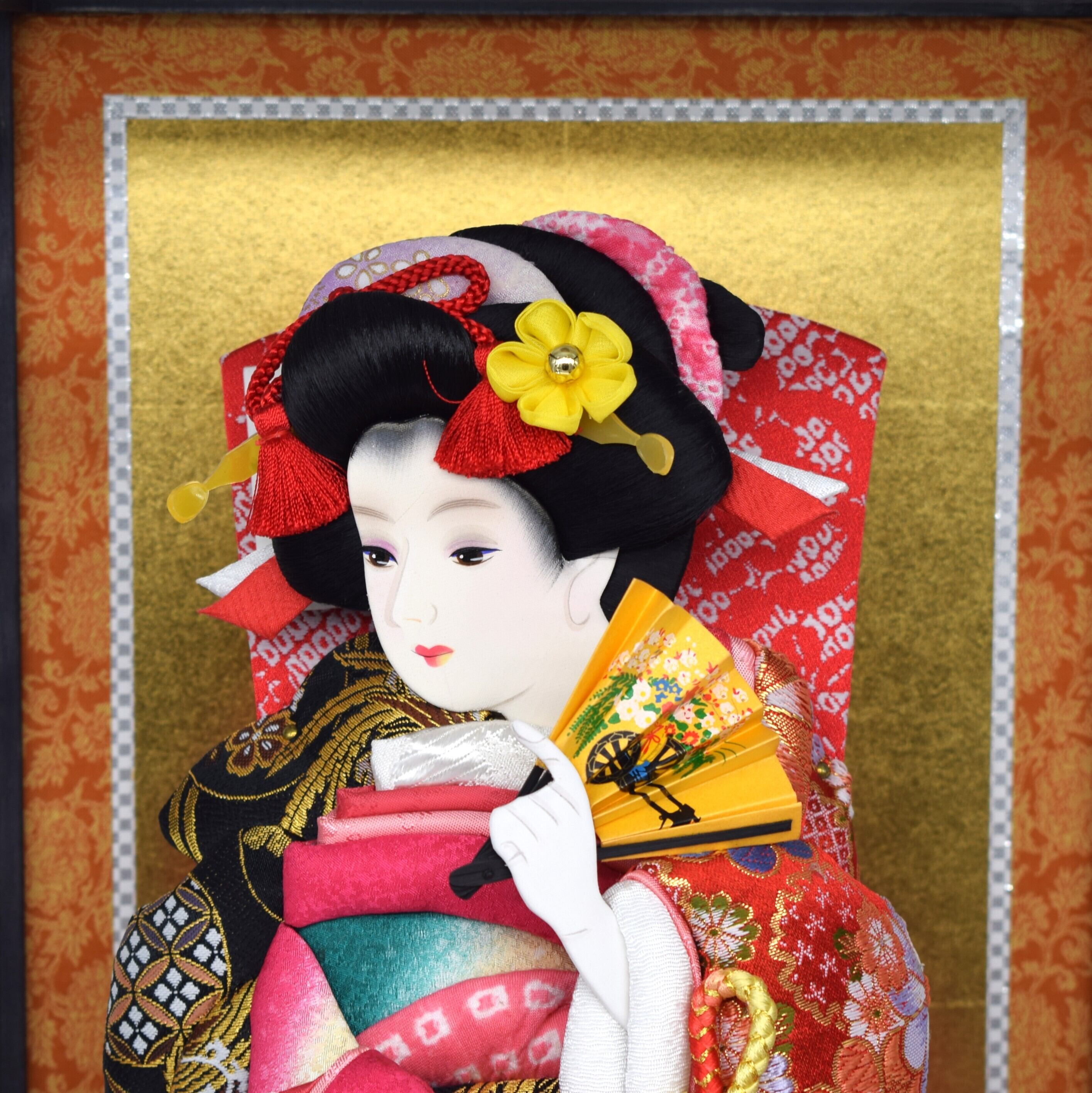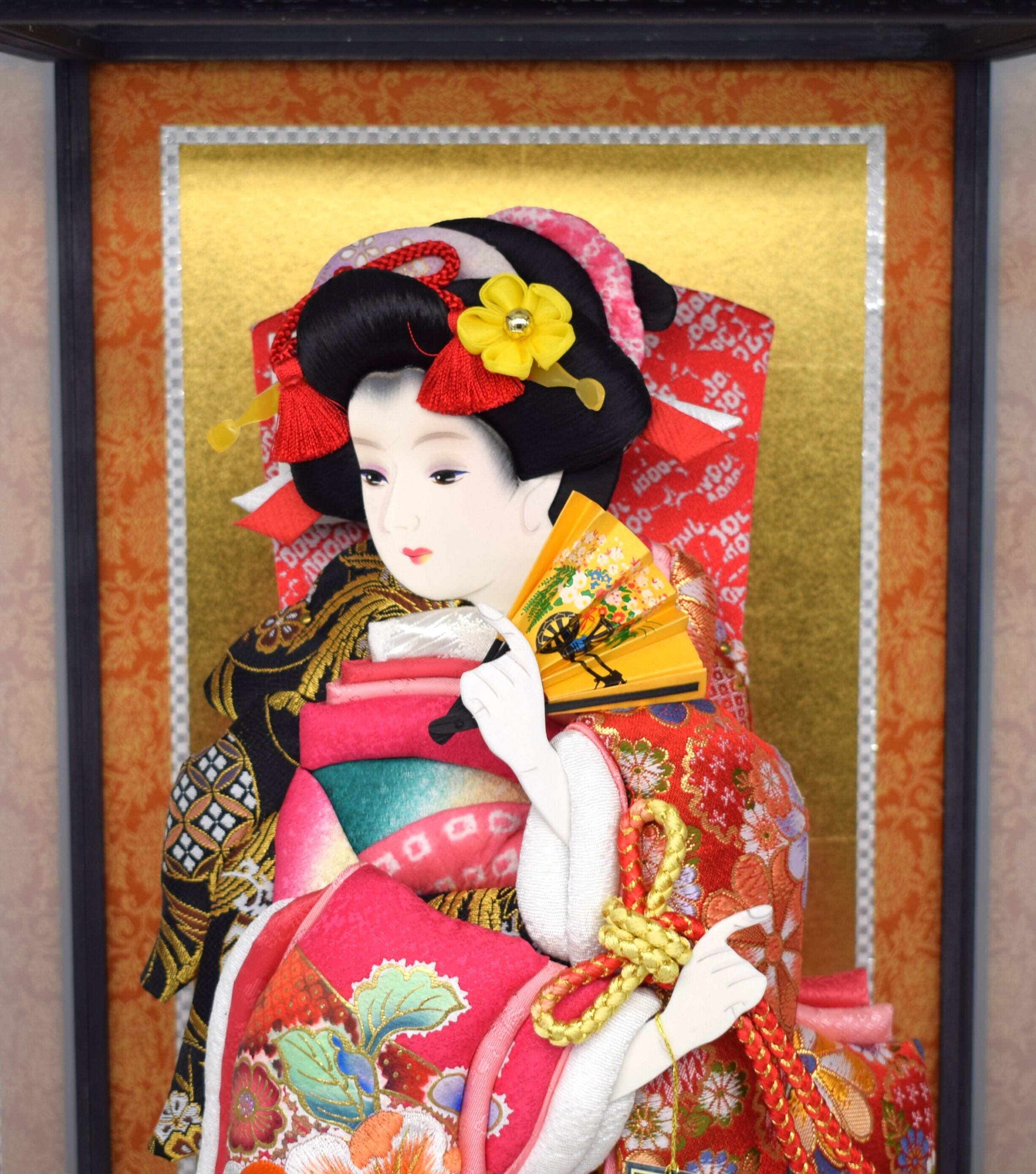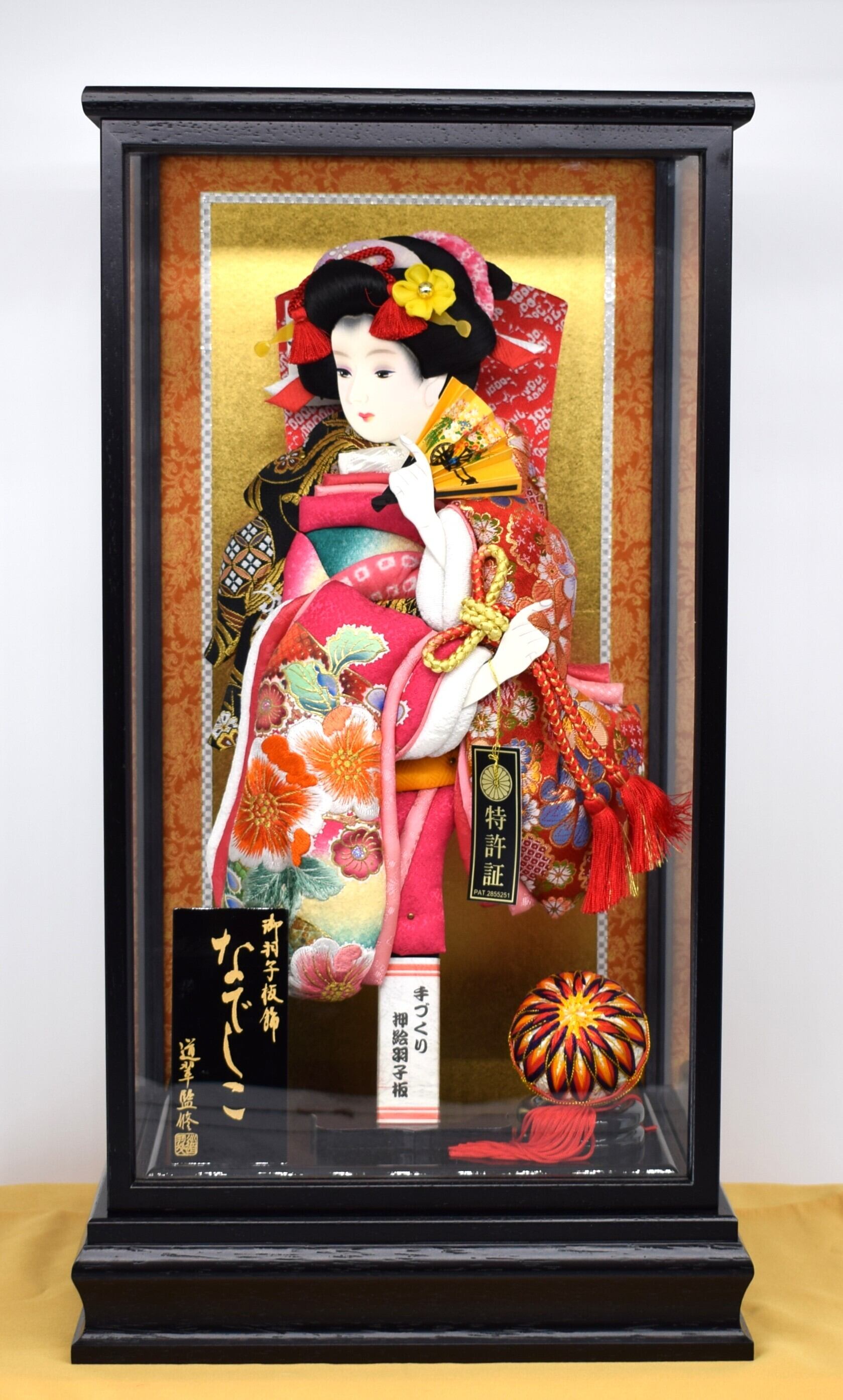 華やかな金襴生地と美しい刺繍を贅沢に使用した、高級感あふれるケース入り羽子板です。振袖には鮮やかな花柄が丁寧に縫い込まれ、立体的で存在感のある仕上がりとなっています。金糸が織り込まれた金襴は見る角度によって輝きが変わり、お祝いの席にふさわしい豪華さを演出します。華麗な金襴と精緻な刺繍が光る、凛とした美しさの逸品。