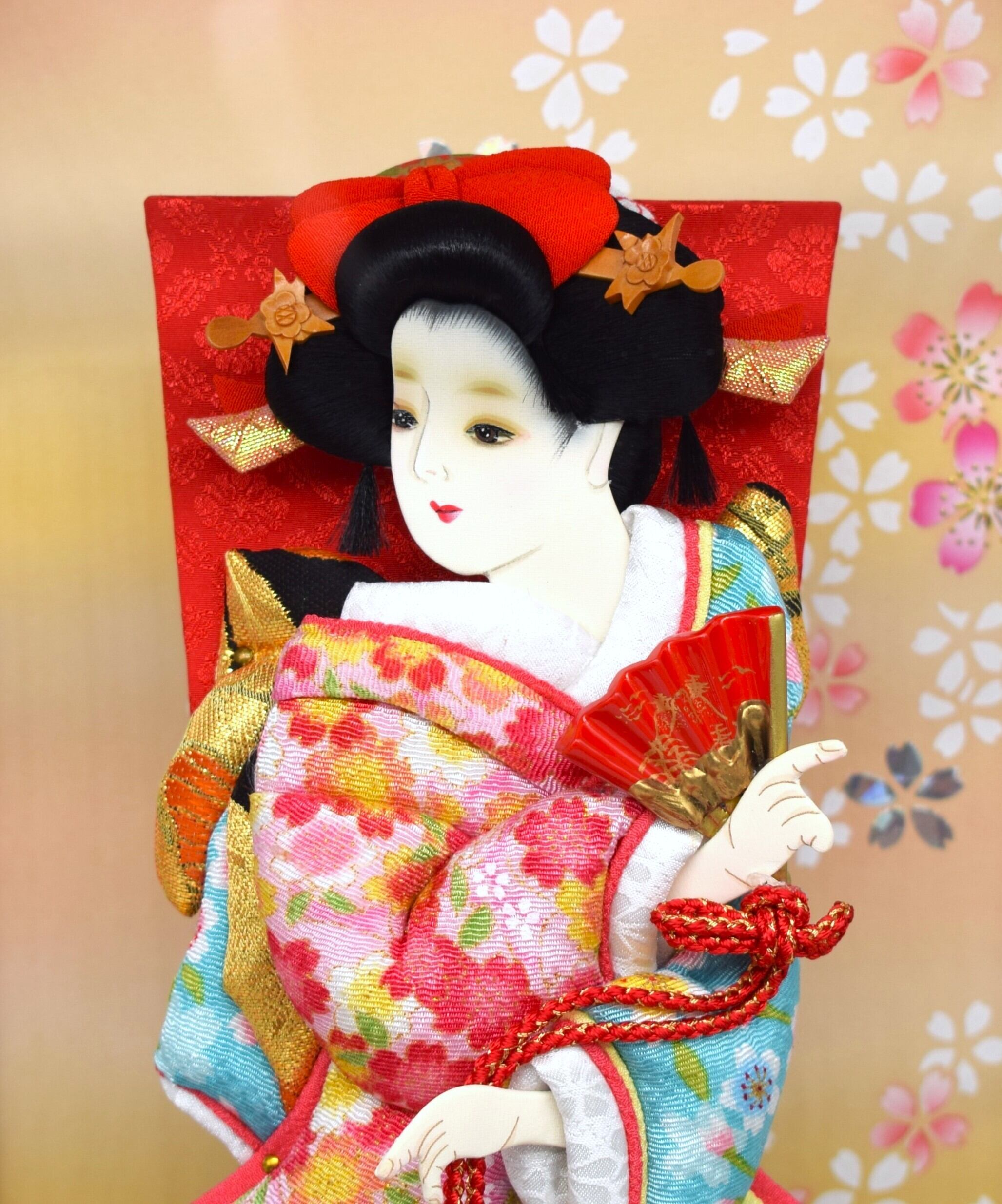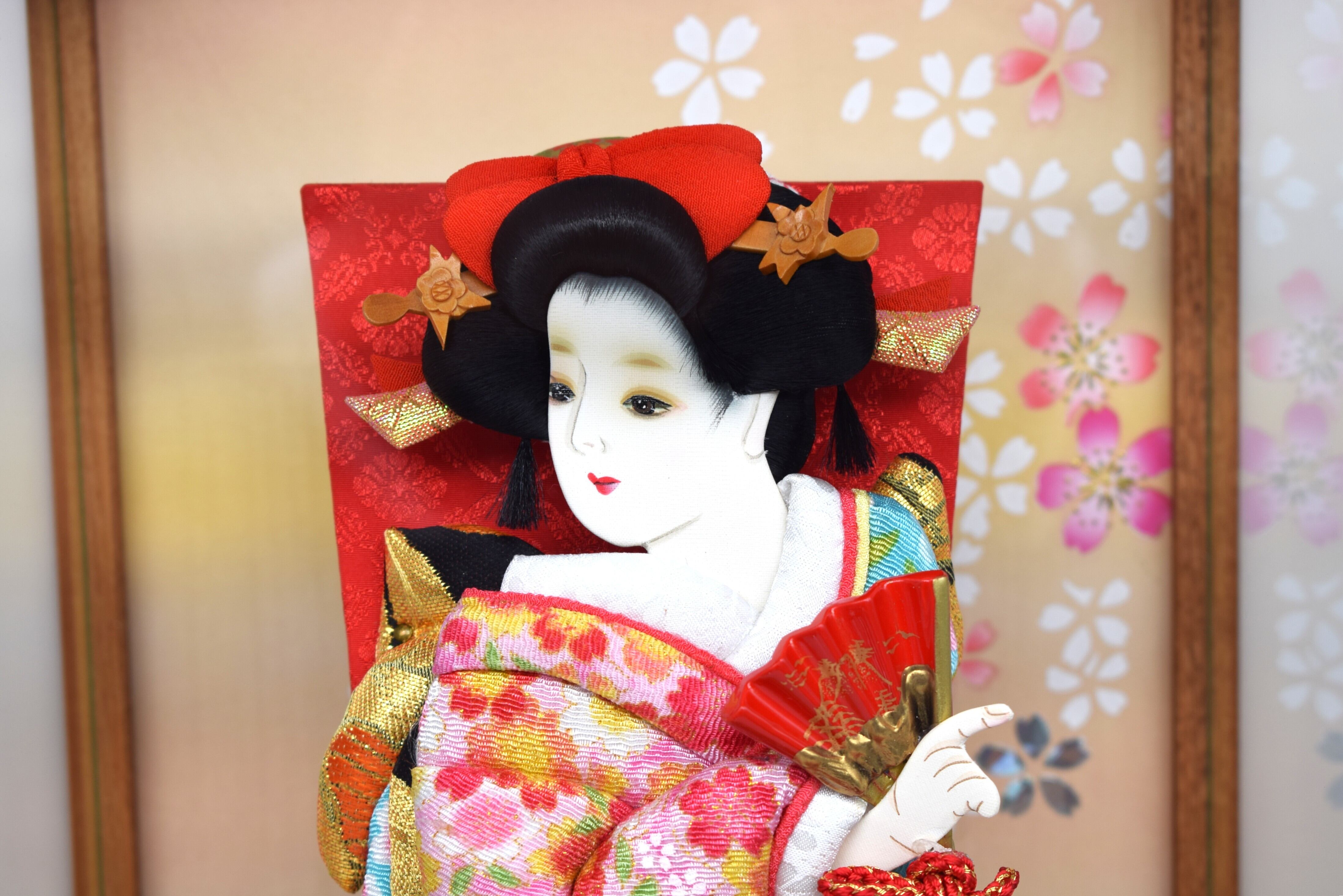 お顔は白肌で優しい表情の美人仕上げ。初正月を迎えるお子様の健やかな成長と幸福を願う、飾りものとして最適です。背景には桜が舞う絵柄を配し、羽子板の華やかさがより一層引き立つデザインとなっています。