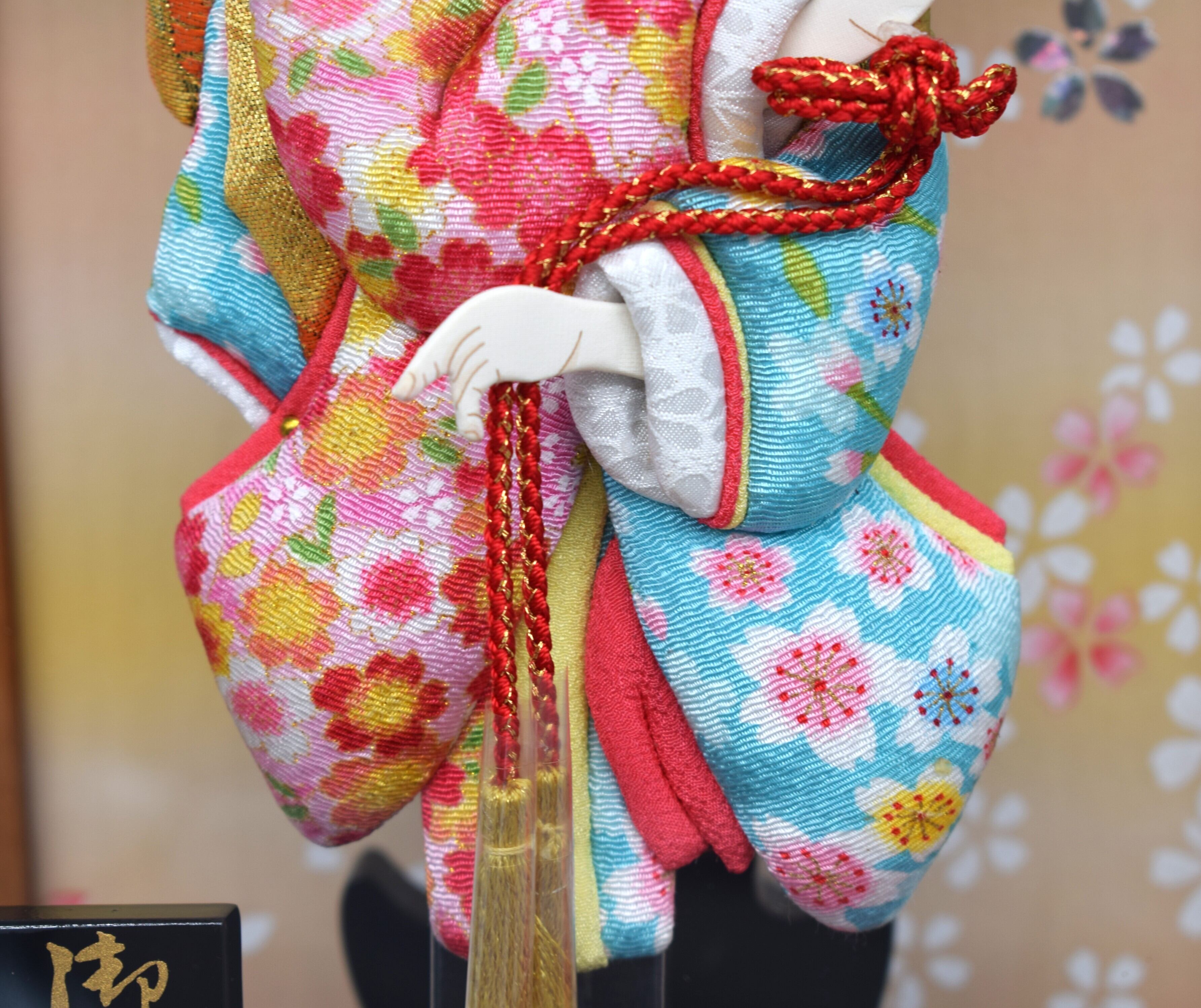 柔らかな風合いと独特の凹凸(シボ)が魅力のちりめん生地を贅沢に使用した、優雅で愛らしいケース入り羽子板です。淡い水色と桃色を基調にした振袖には、華やかな桜や梅の柄がふっくらと立体的に浮かび上がり、縮緬ならではの上品な質感を存分に楽しめます。