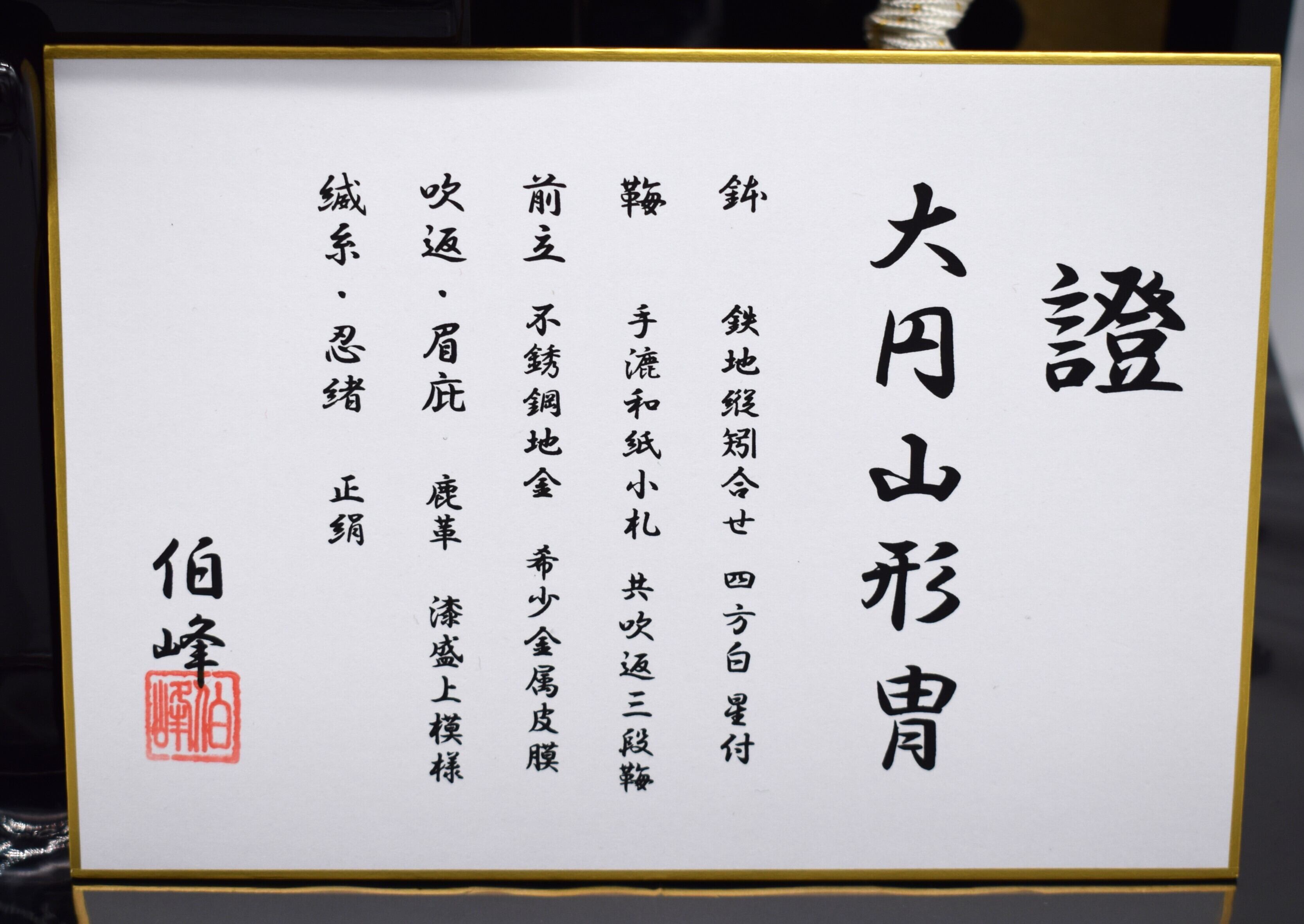 本作は、甲冑師 伯峰 による伝統的な様式を再現した 大円山形冑(おおえんざんなりかぶと)。