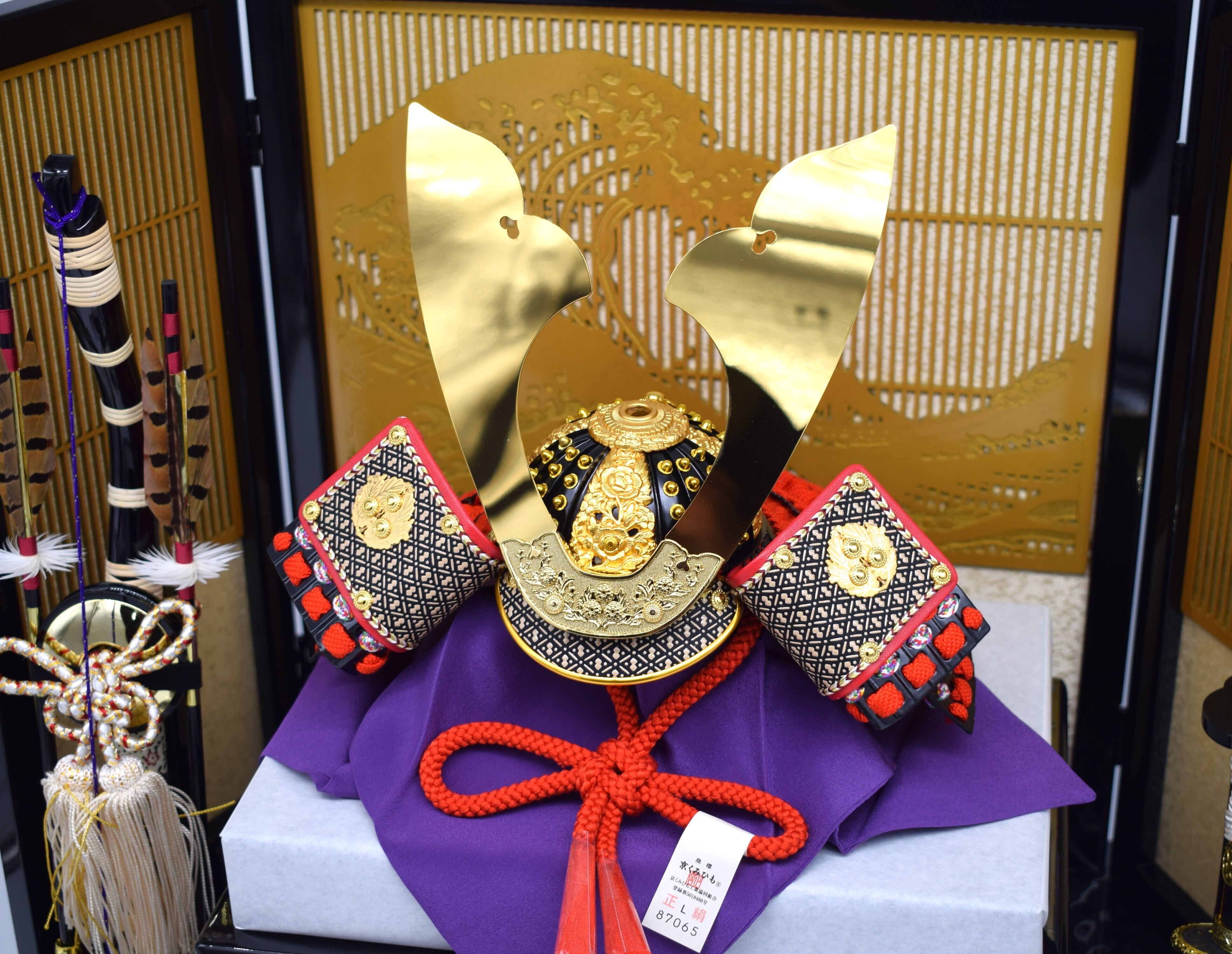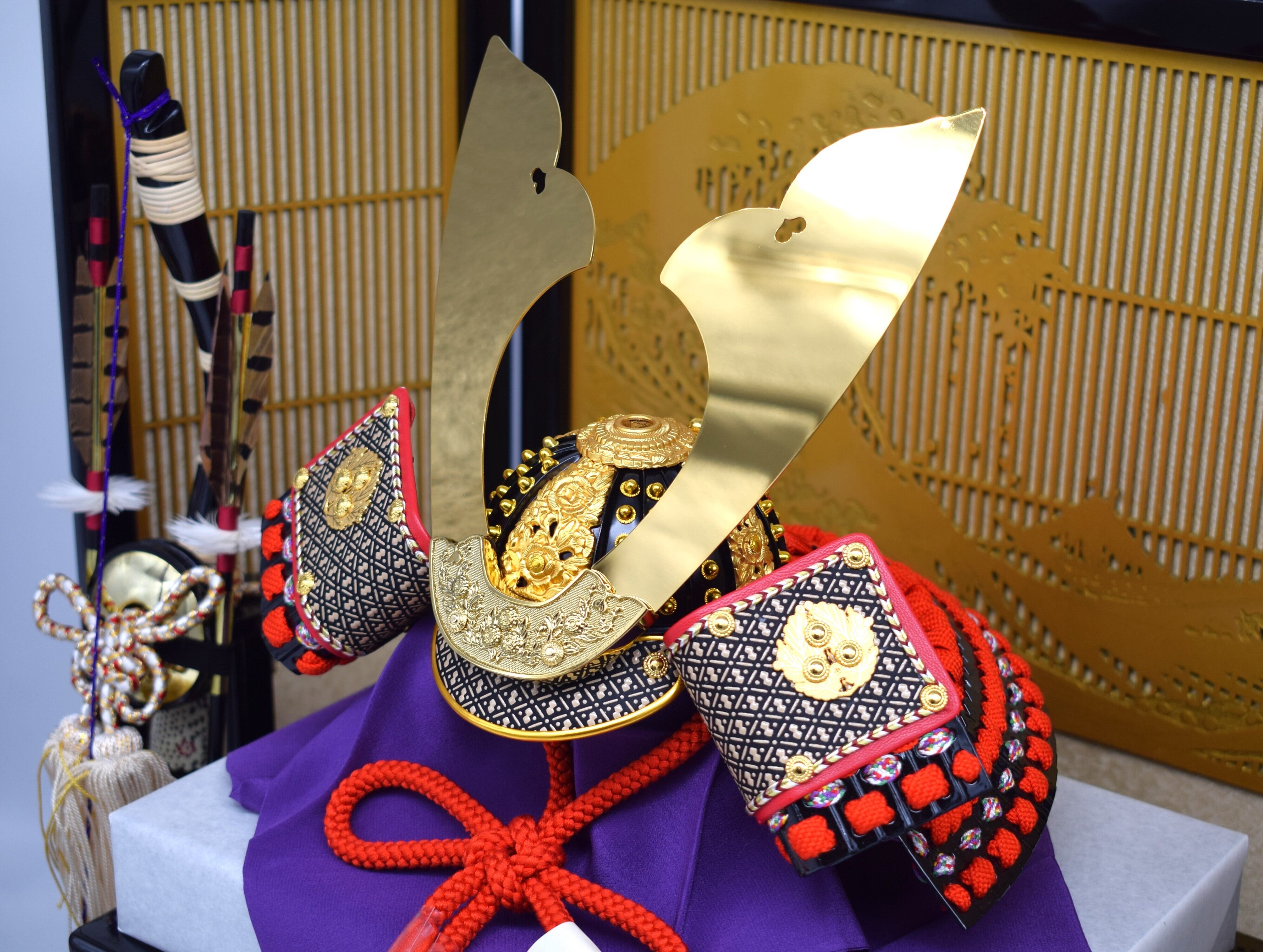 金屏風と弓太刀を備えた豪華な飾りは、端午の節句を華やかに彩ります。