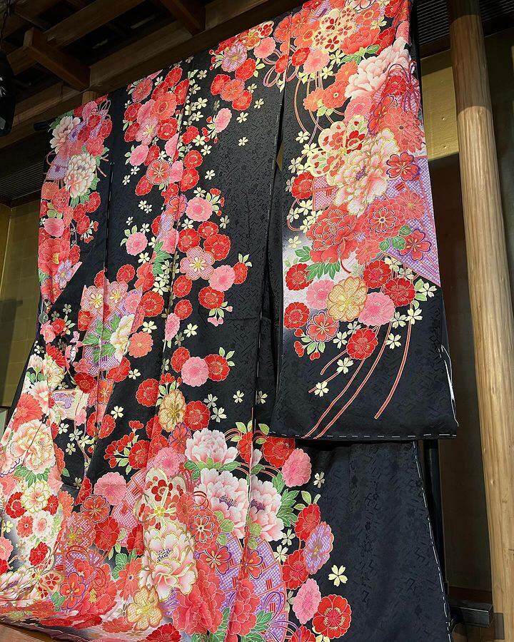 黒地に牡丹の友禅柄が施された未仕立て振袖「ひいな」です。伝統的な柄と現代的なデザインが融合した一着で、大人の女性にふさわしい上品で華やかな雰囲気を演出します。