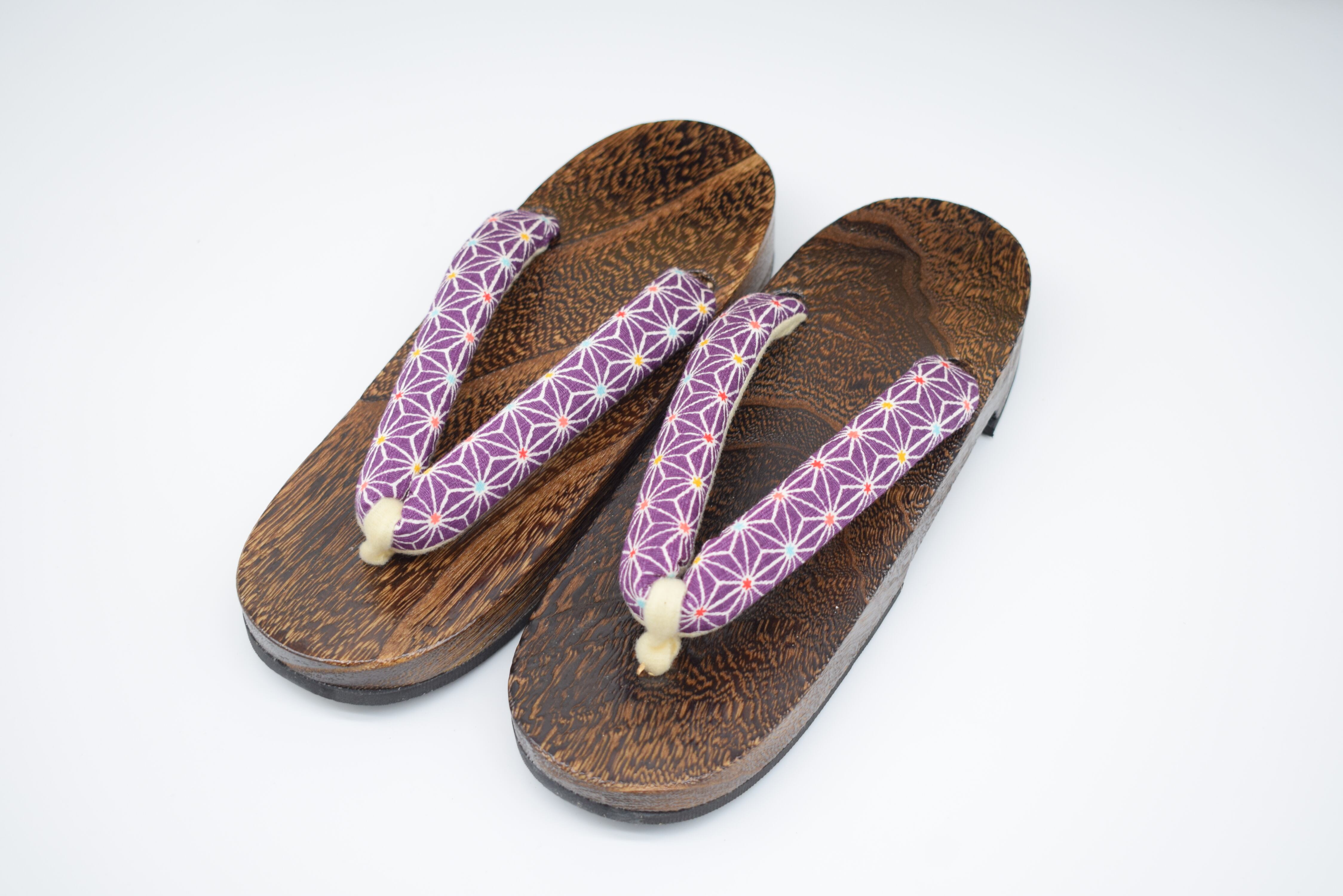 この下駄は、優雅な麻の葉模様と深みのある紫色が特徴で、あなたの足元に華やかさと個性をプラスします。和装はもちろん、カジュアルなコーディネートにもぴったりで、どんなシーンでもあなたを引き立ててくれることでしょう。