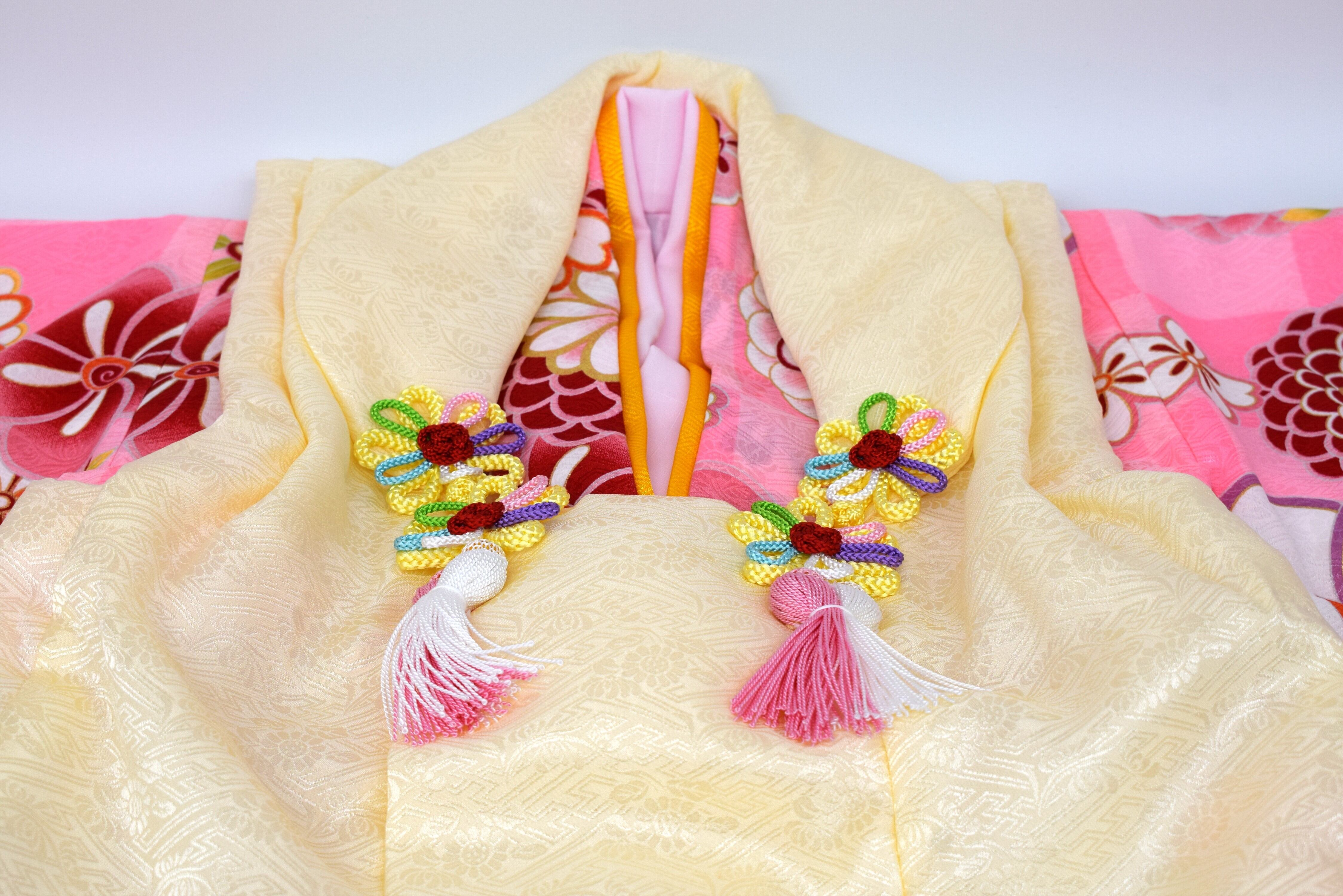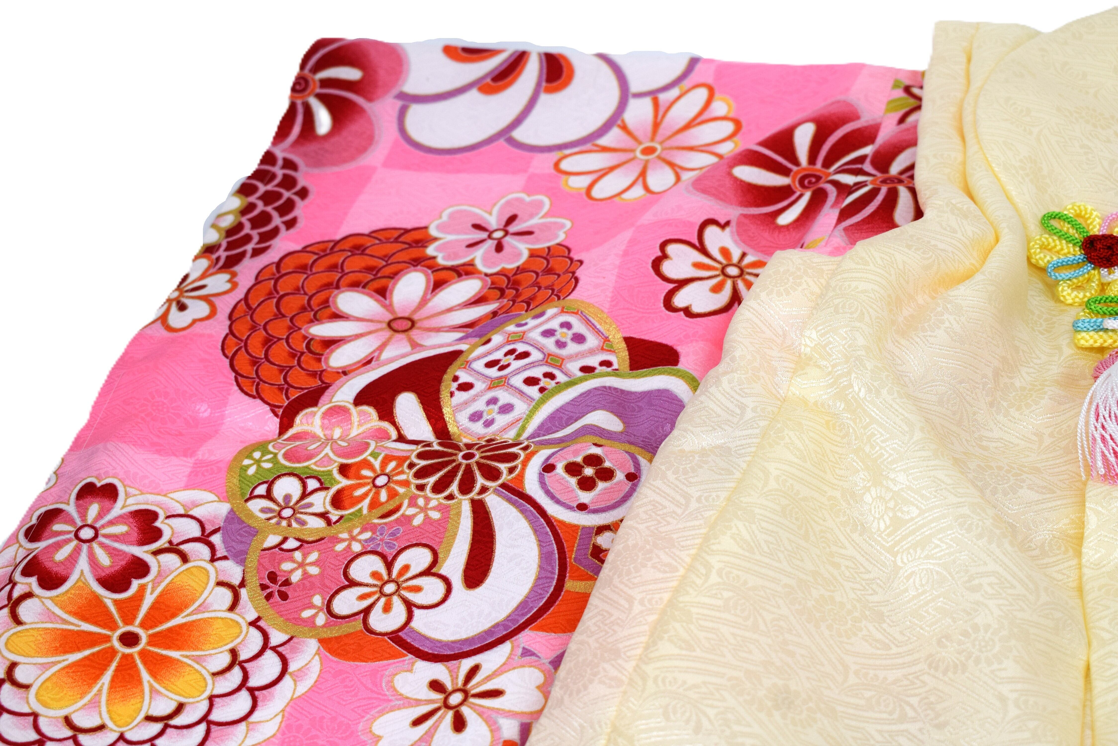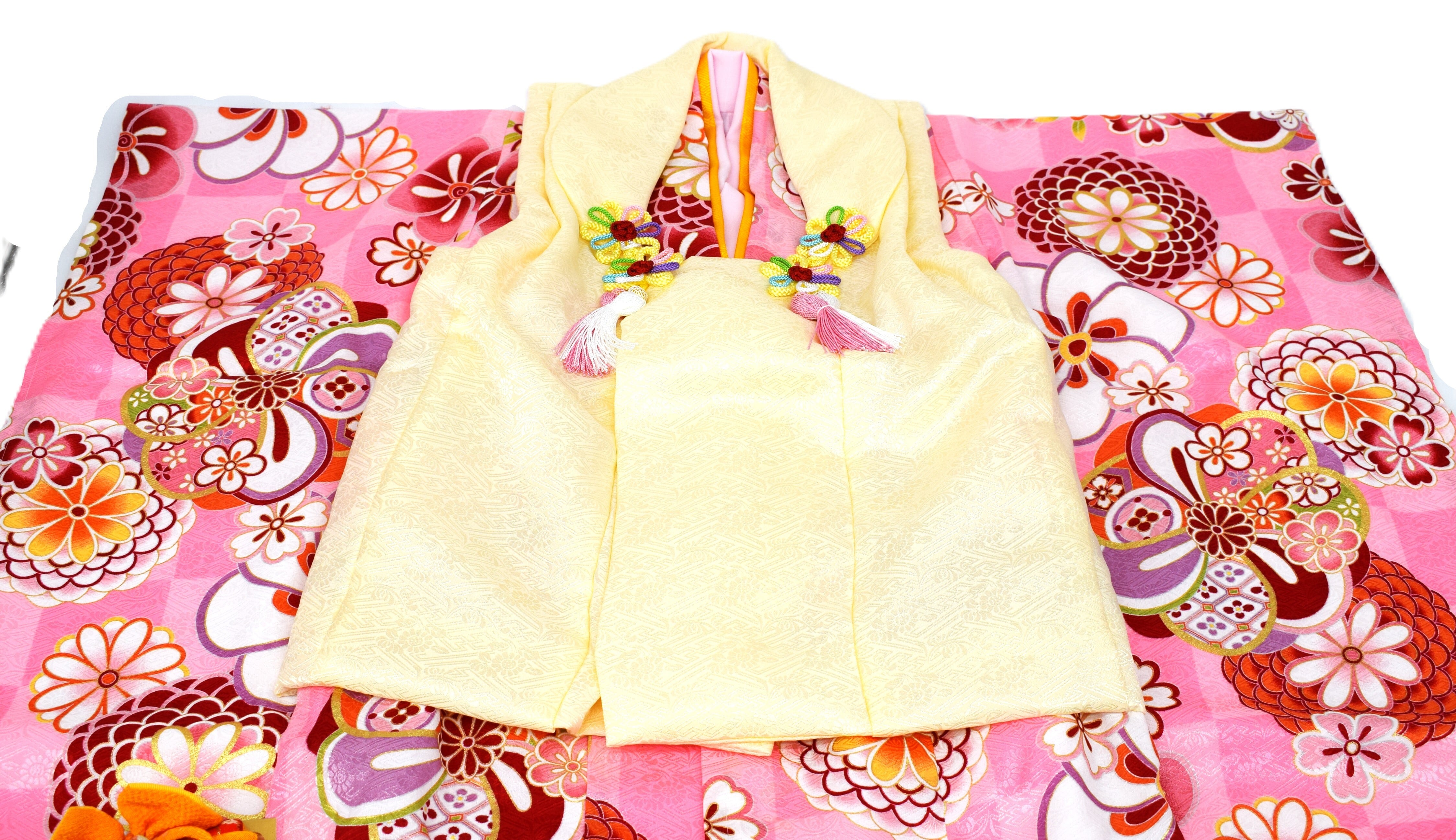 七五三のお祝いにぴったりな、華やかな着物と被布のフルセットです。可愛らしいピンク地に伝統的な和花模様が描かれたデザインで、お子様の晴れの日を美しく演出します。被布コートは上品なアイボリーカラーで、繊細な地模様が施されており、高級感のある仕上がりになっています。