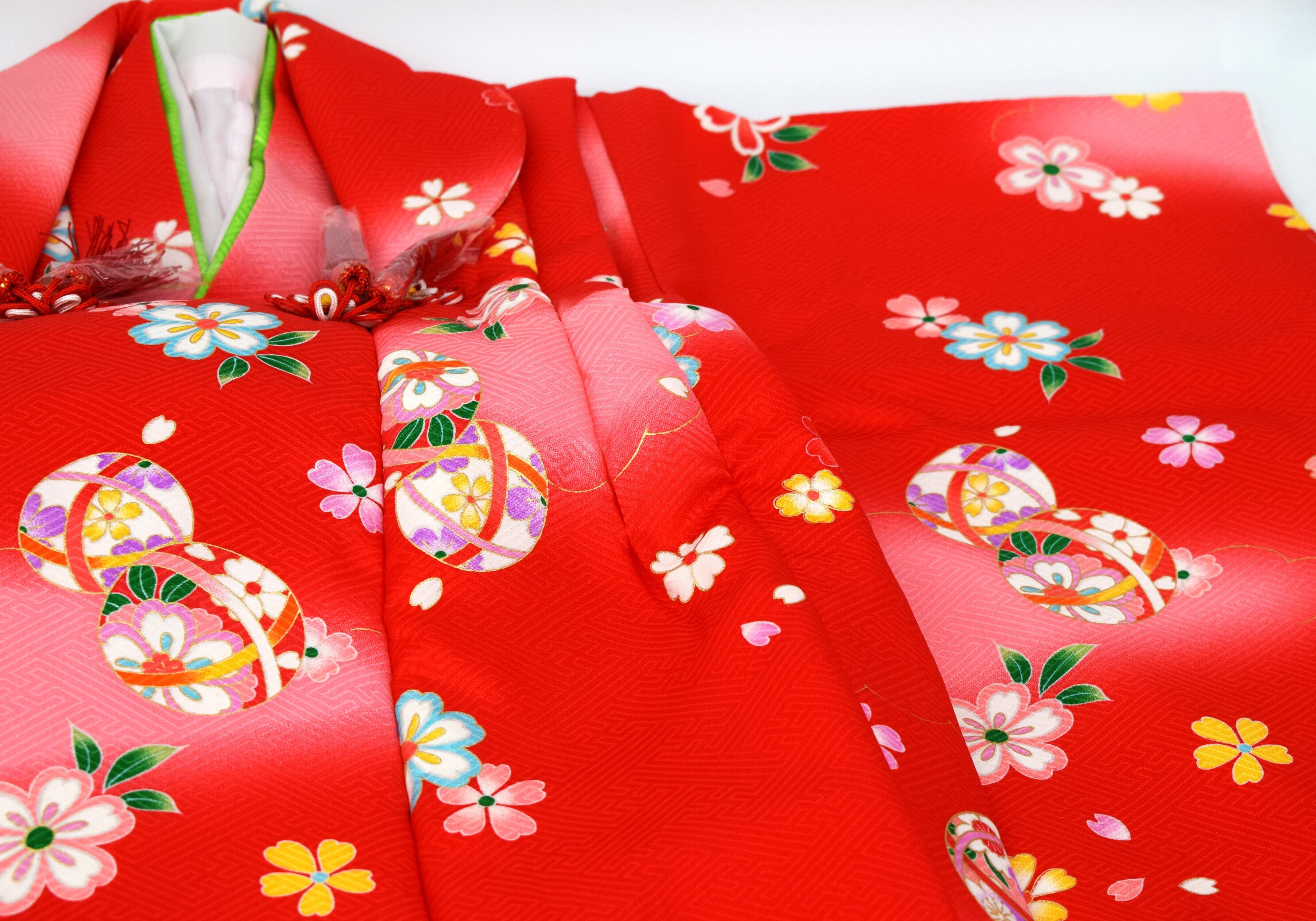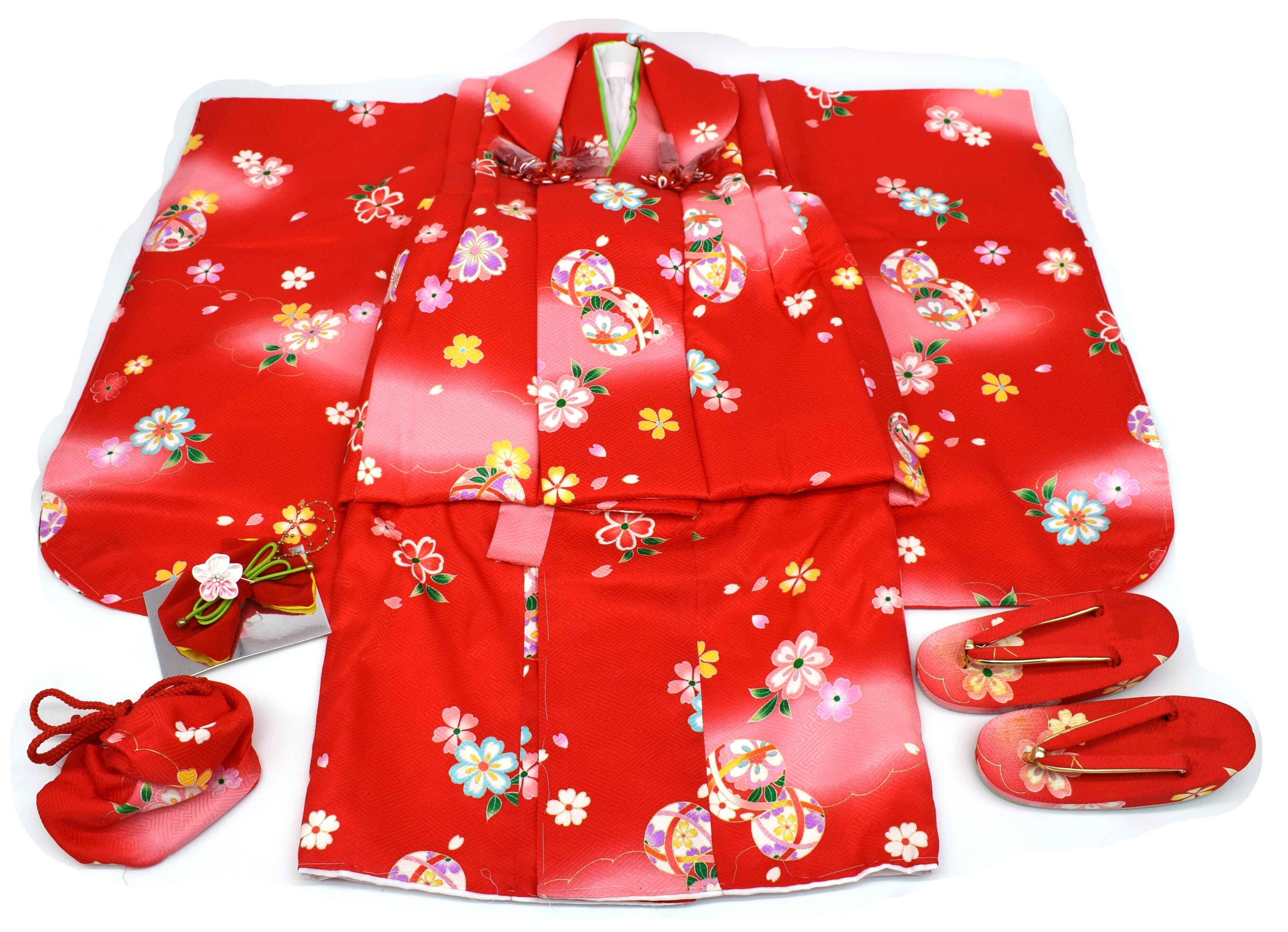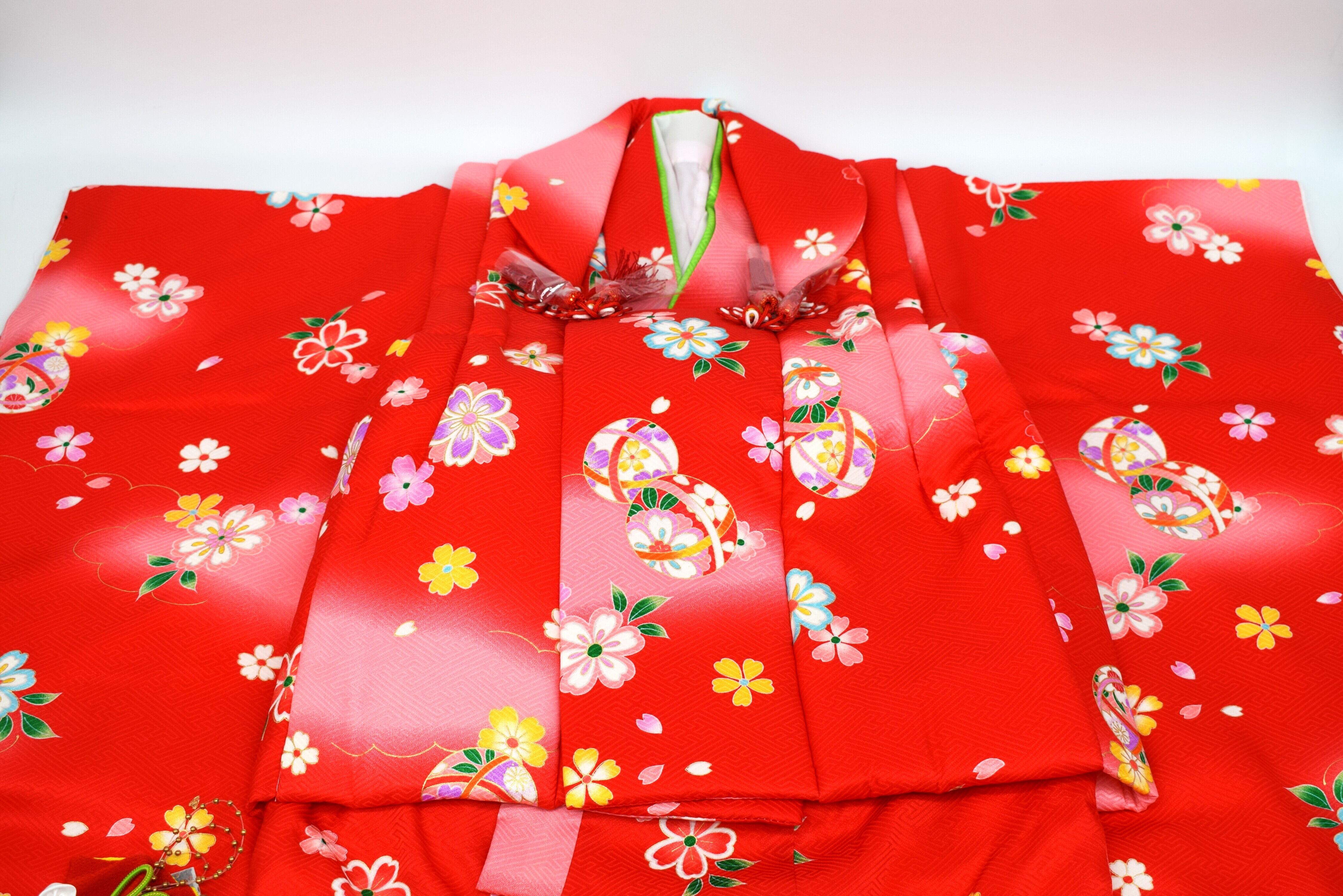 七五三 女の子 3歳用 着物フルセット(赤 × まり柄 × 桜模様)