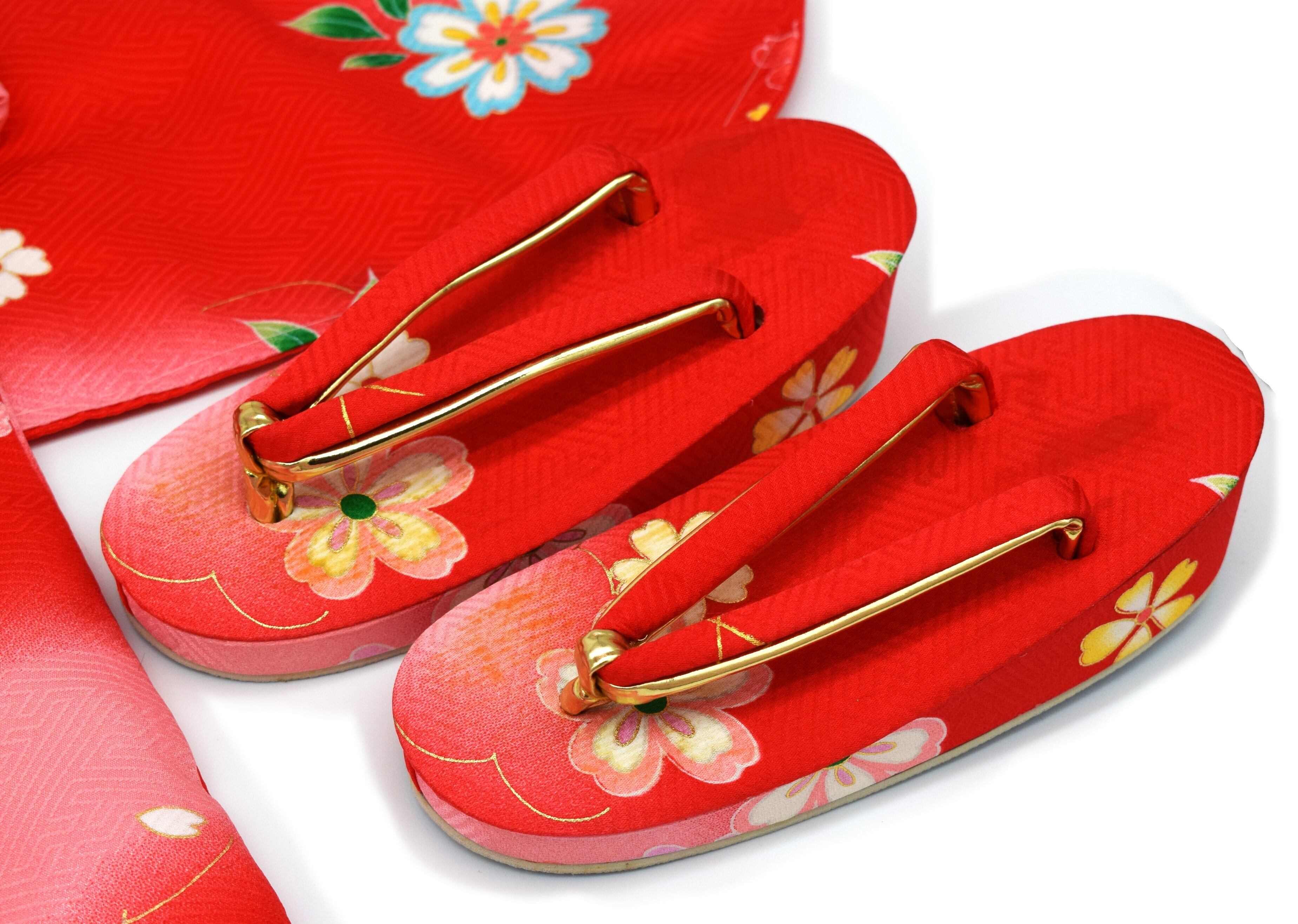 鮮やかな赤を基調に、まりや桜の花がちりばめられた華やかで上品なデザイン。
