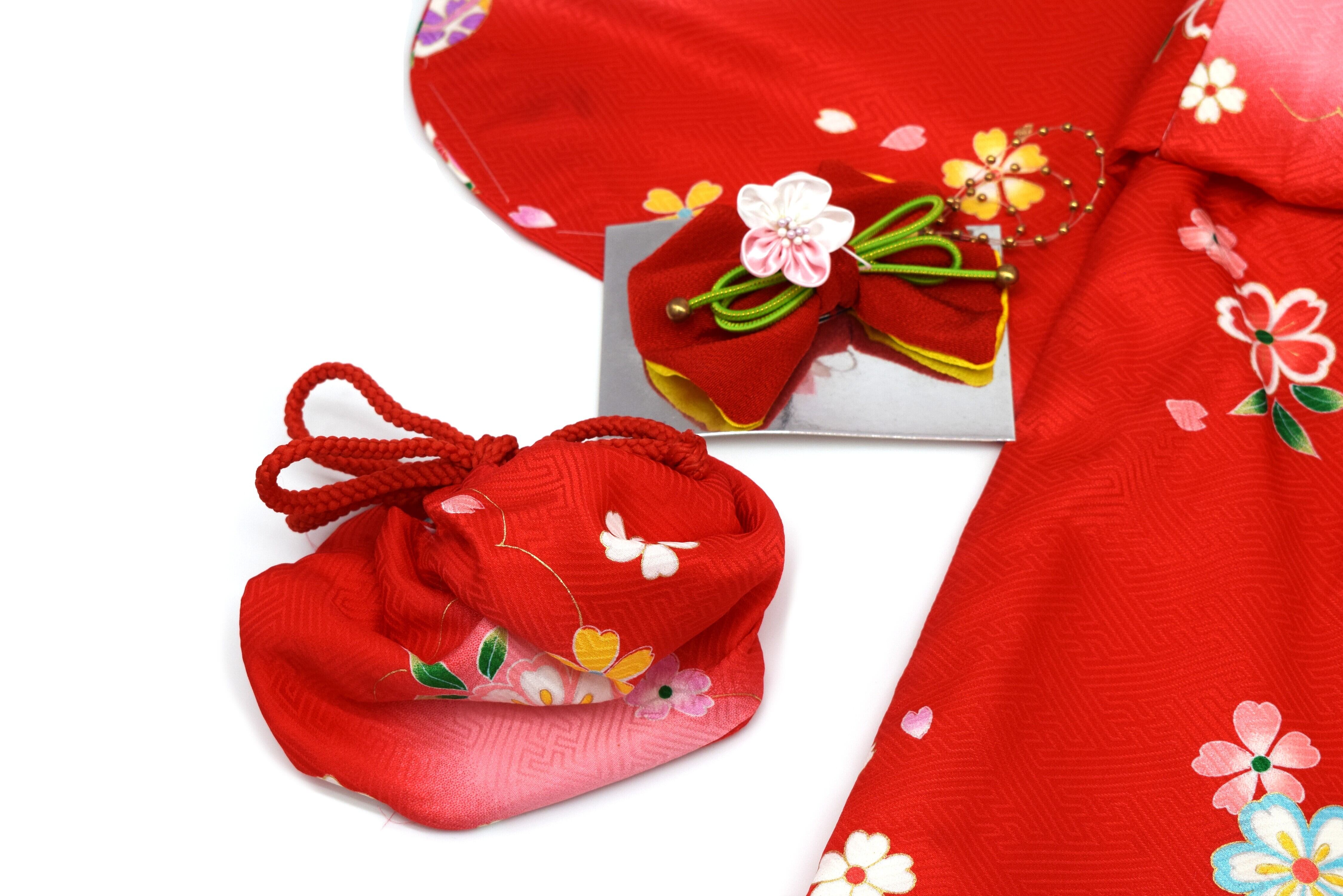 このセットには、着物・被布(ひふ)・草履・巾着袋・髪飾りが含まれており、特別な日にすぐに着用できます。