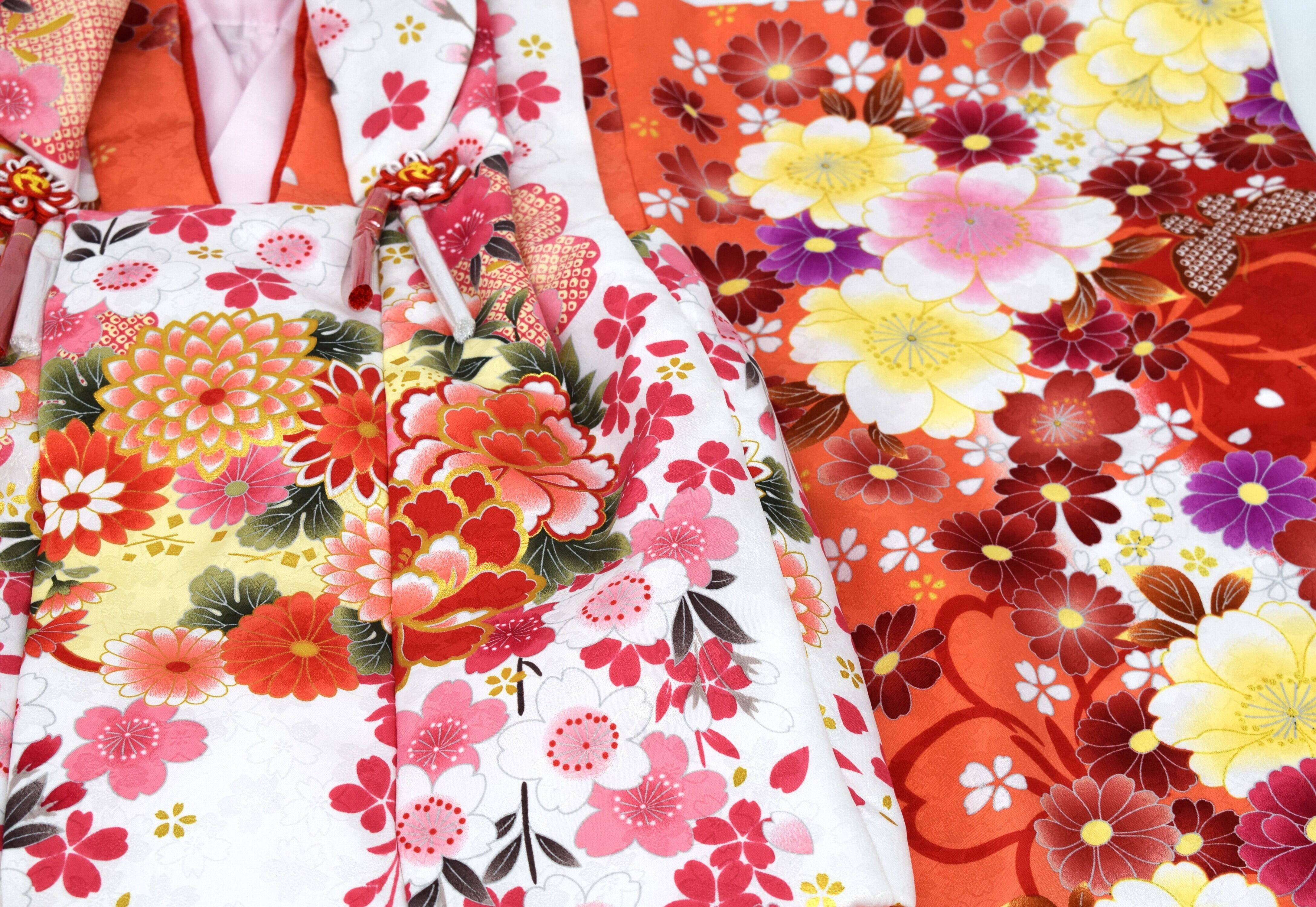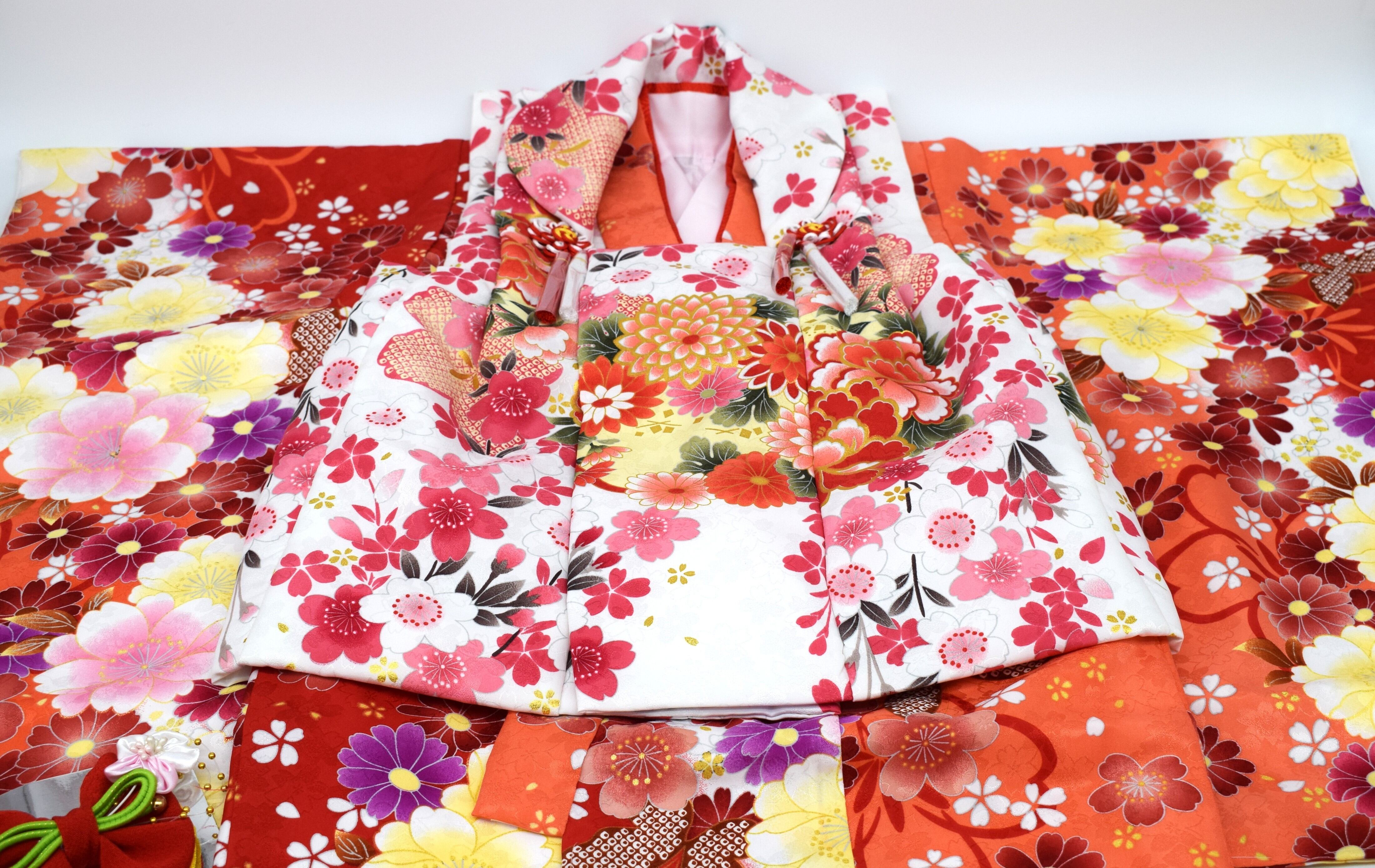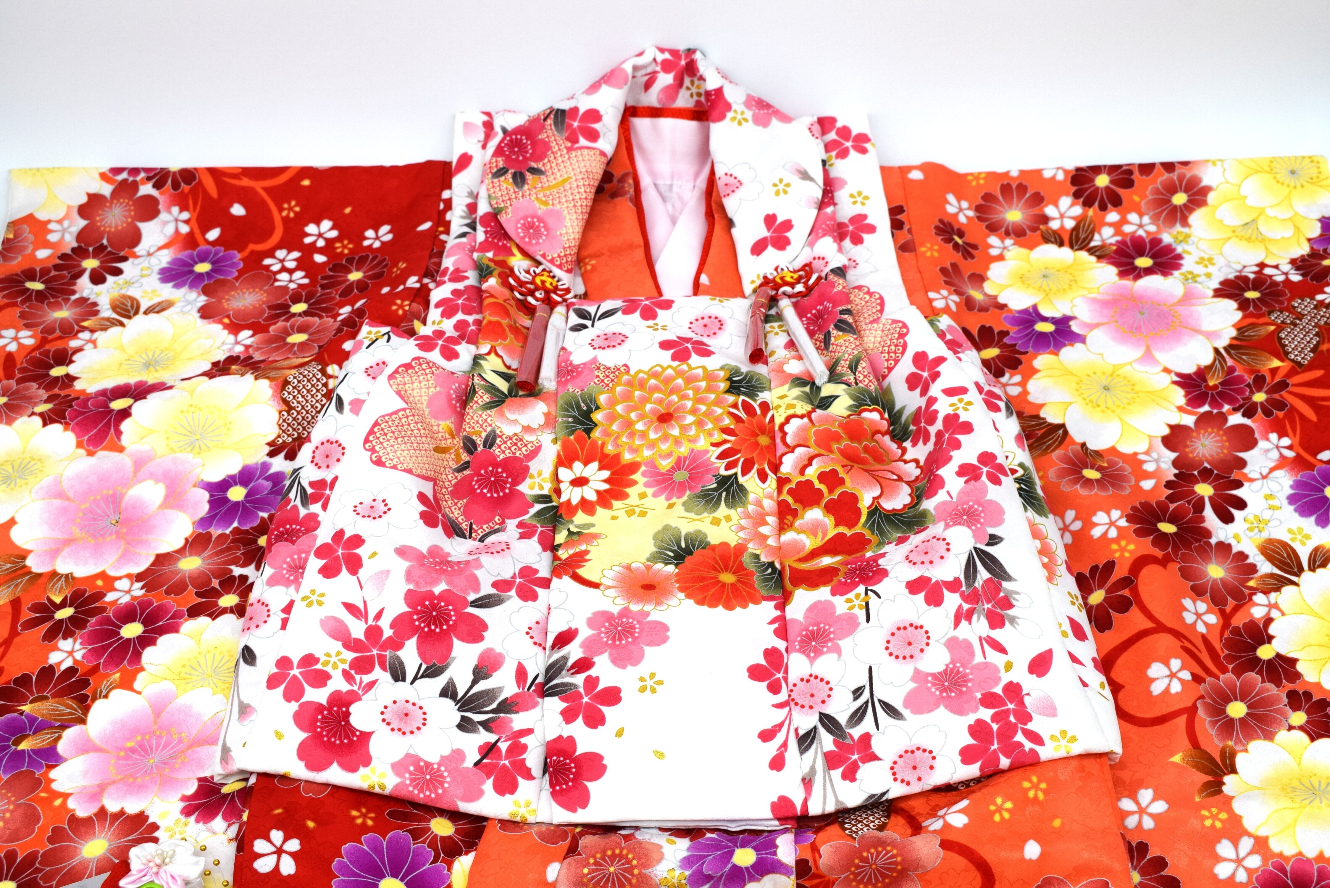 赤とオレンジを基調とした豪華な花柄の着物に、白地の被布(ひふ)を合わせた伝統的なデザイン。